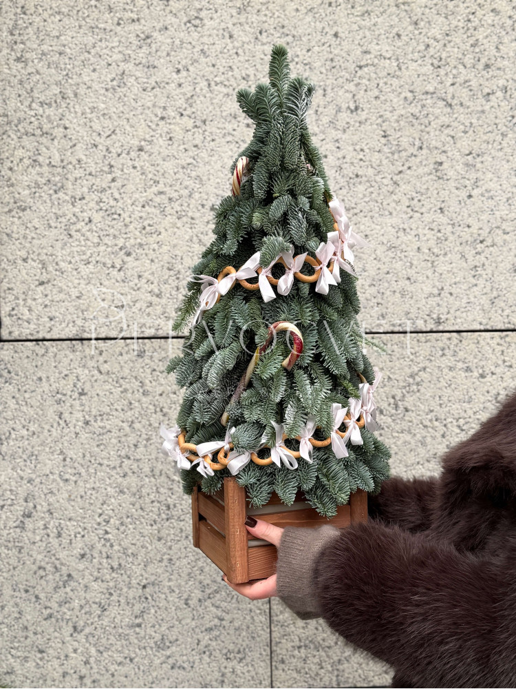 Елочка из натуральной пихты Нобилис в кашпо с декором из деревянных Звездочек и шариков. Ваша главная или дополнительная елочка для праздничного настроения или в качестве подарка!