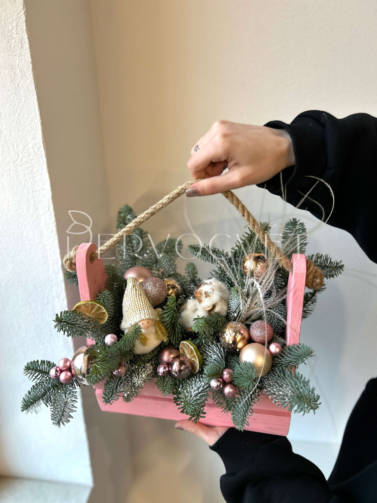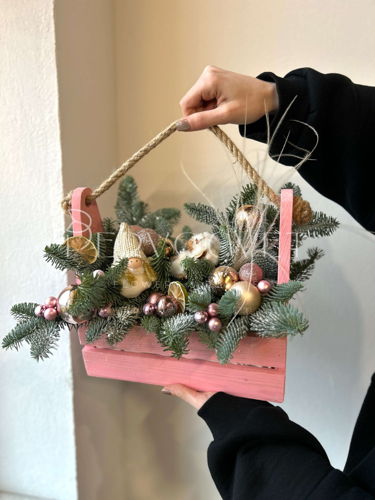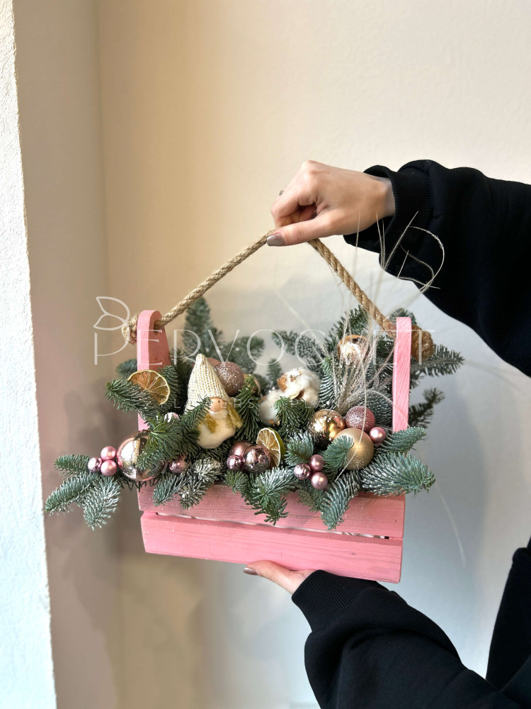 Новогодняя композиция #119 в ящике с розовым декором
