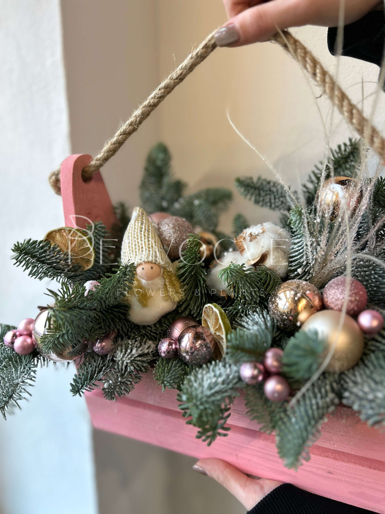 Идеальный подарок на Рождество и Новый Год - композиция в деревянном ящике с нежным декором розового цвета, с акцентом на игрушечного Гномика. Самая милая новогодняя композиция в каталоге!