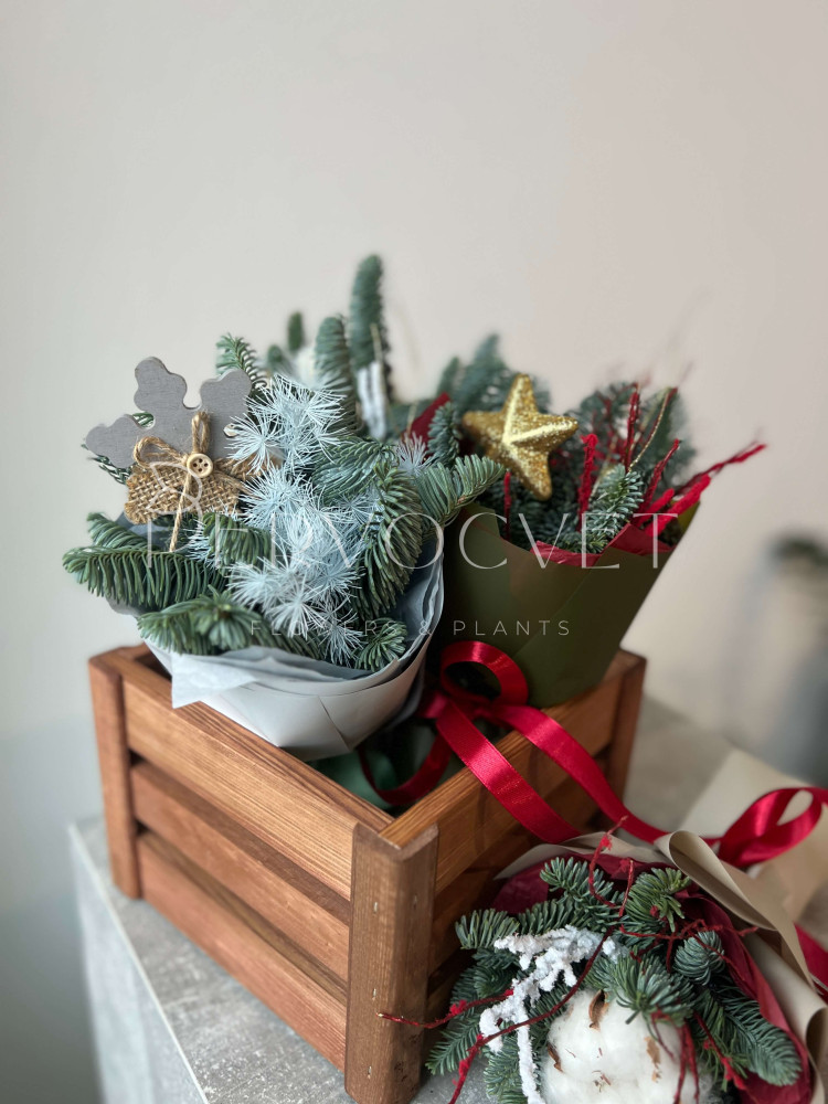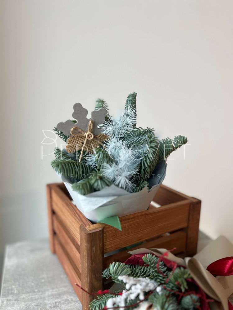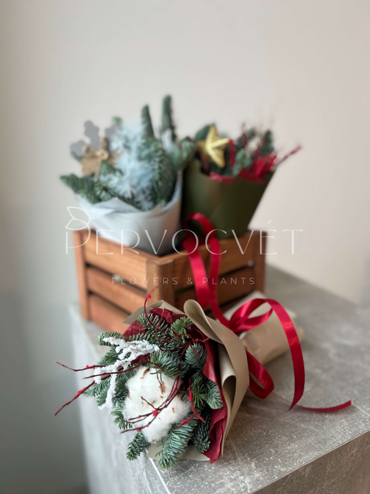 Букет-комплимент с хвоей Нобилис! Букет будет выполнен из хвои и декора из ассортимента в наличии, в примерном размере: высота 20 см, диаметр 12 см.