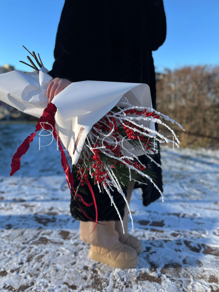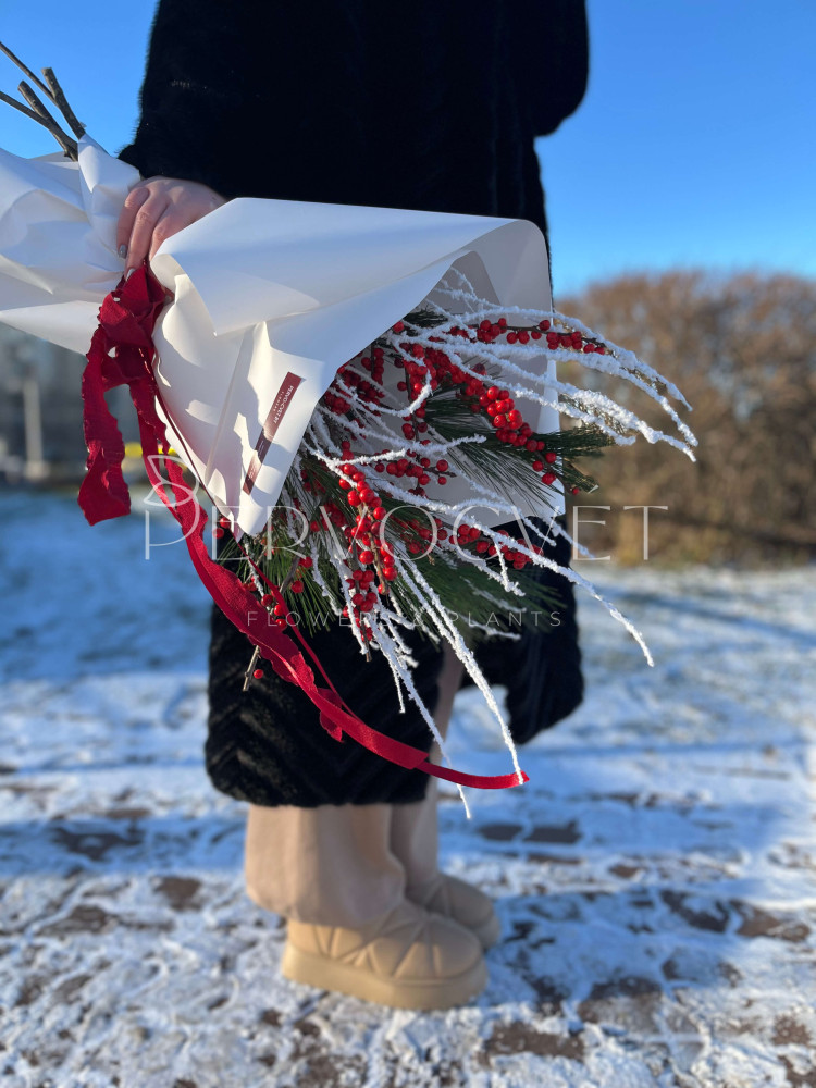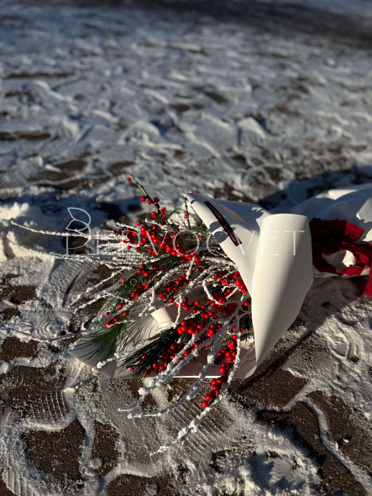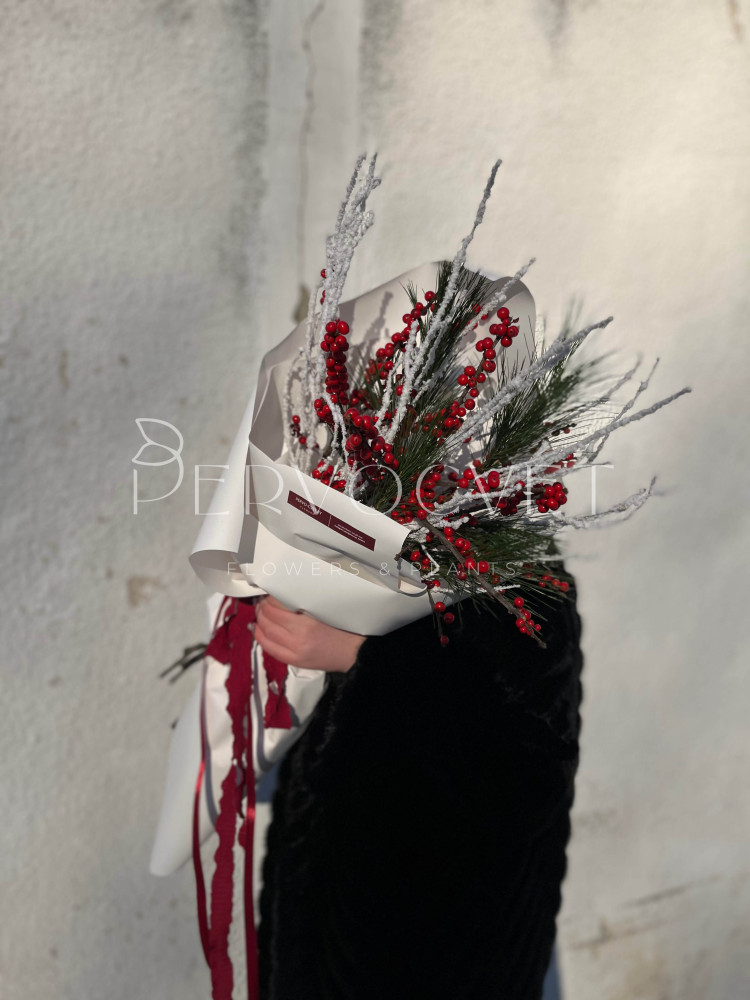 Букет из красных ягод зимнего Илекса, хвои и снежных веток, в белой упаковке с мягкими лентами. Стойкий банч для дома в зимнее время!