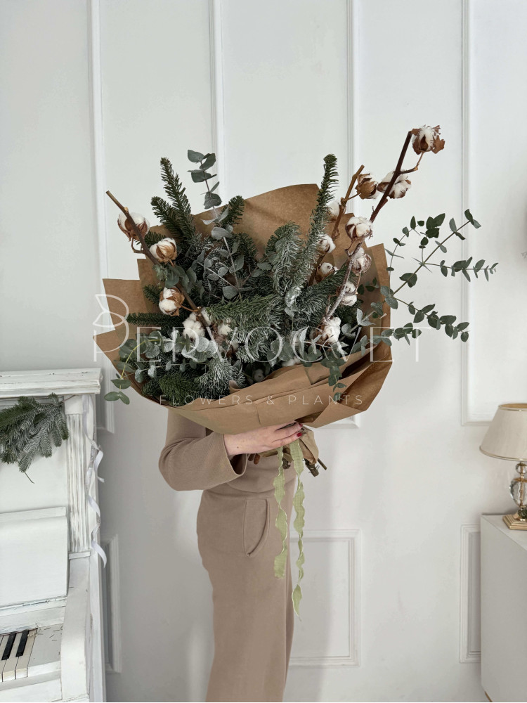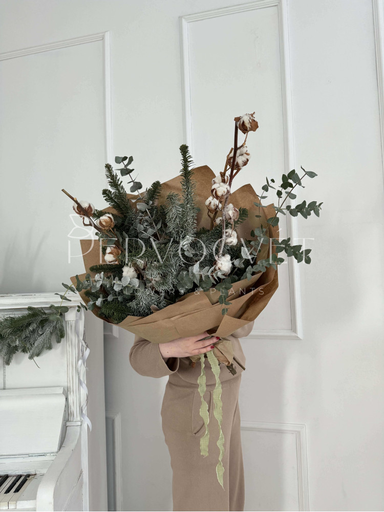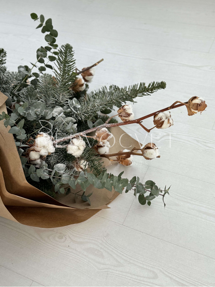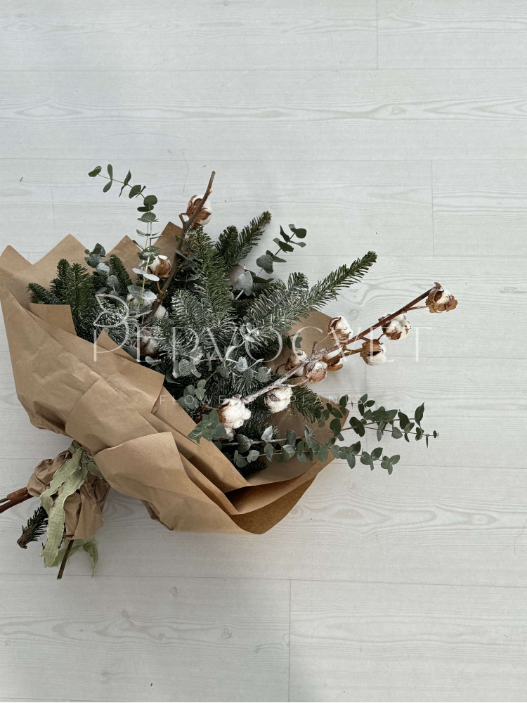 состав: натуральная пихта Нобилис, эвкалипт, хлопок (ветка), искусственный снег