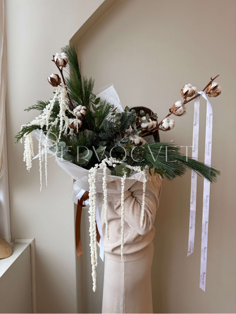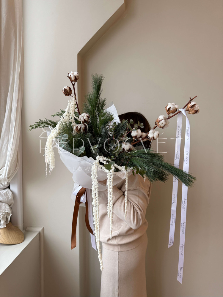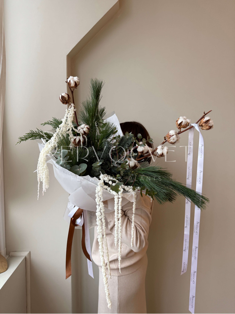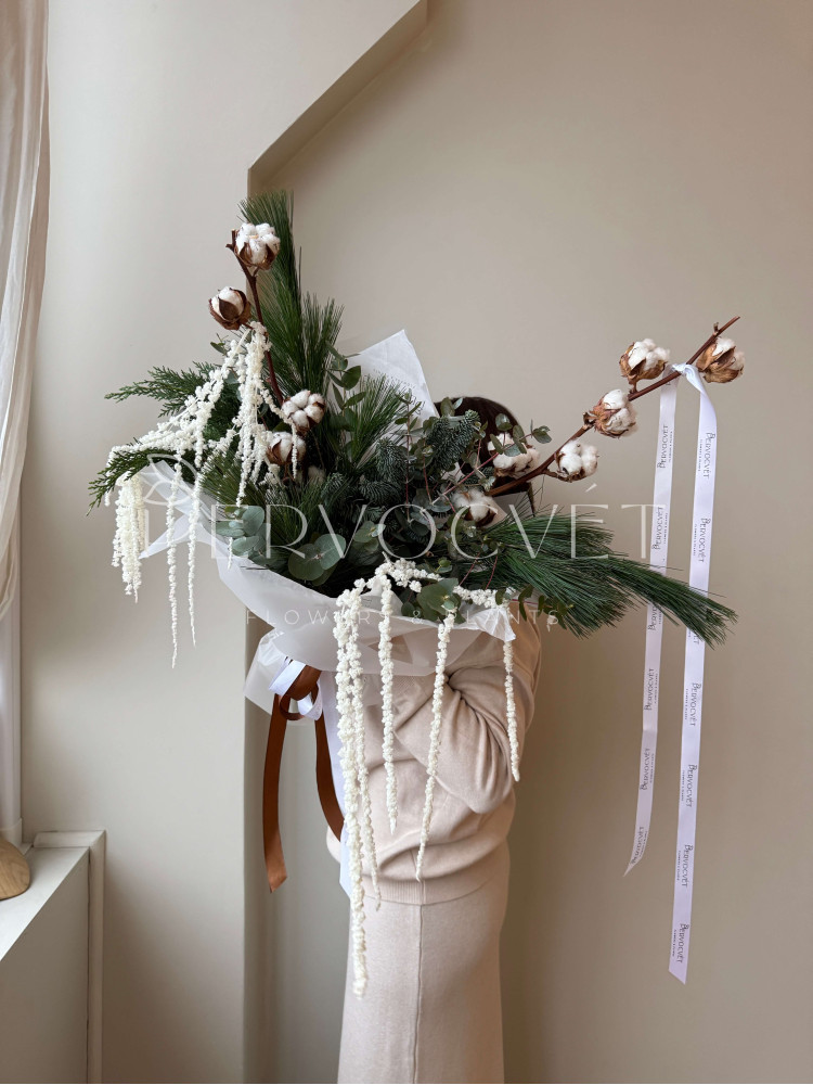 Зимний букет #115 хвоя, снежные ветви и хлопок