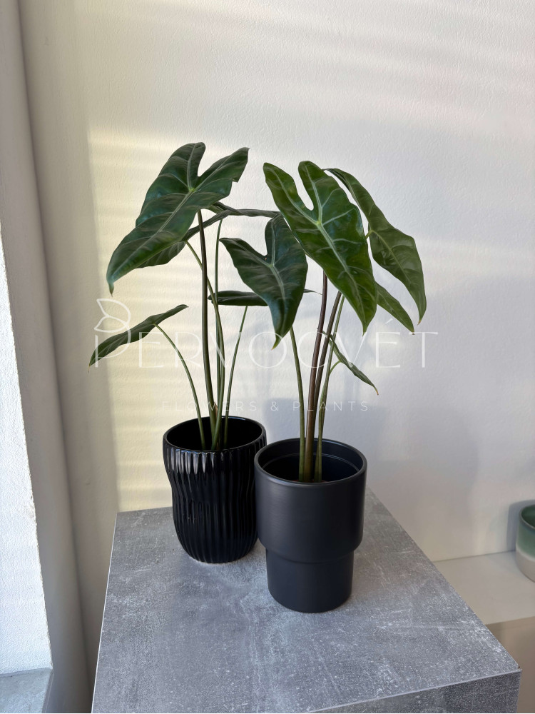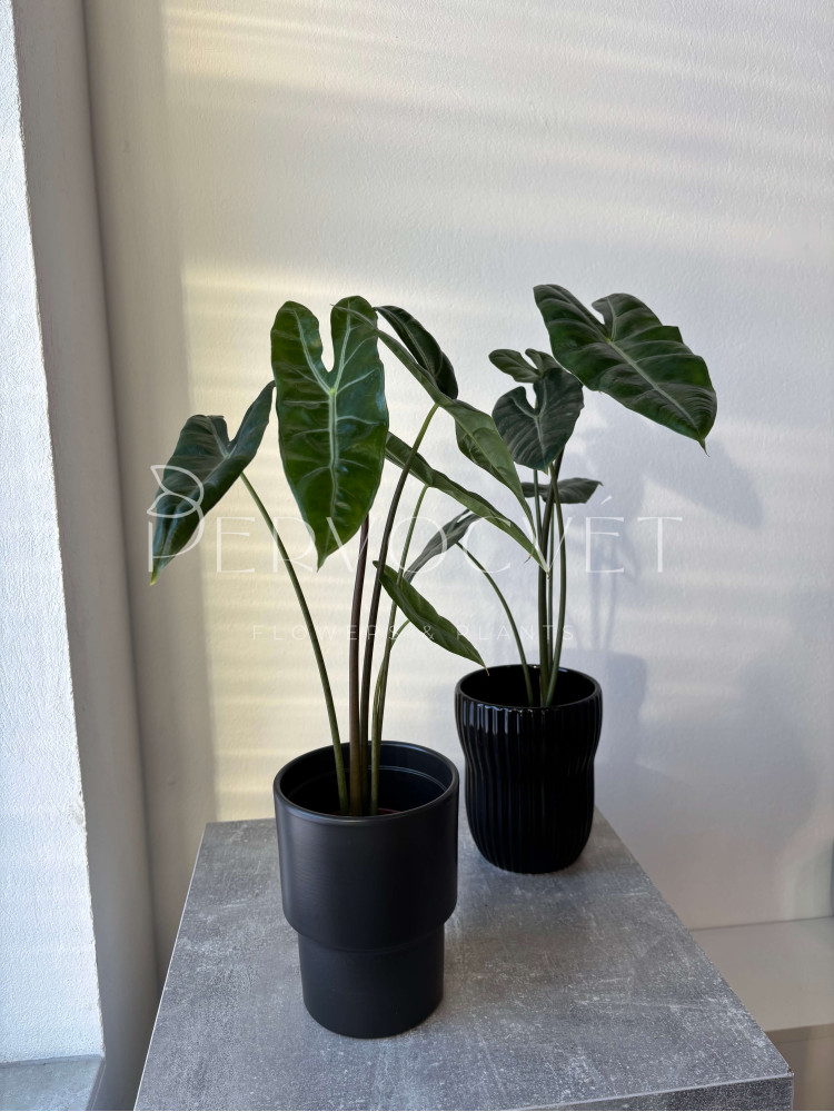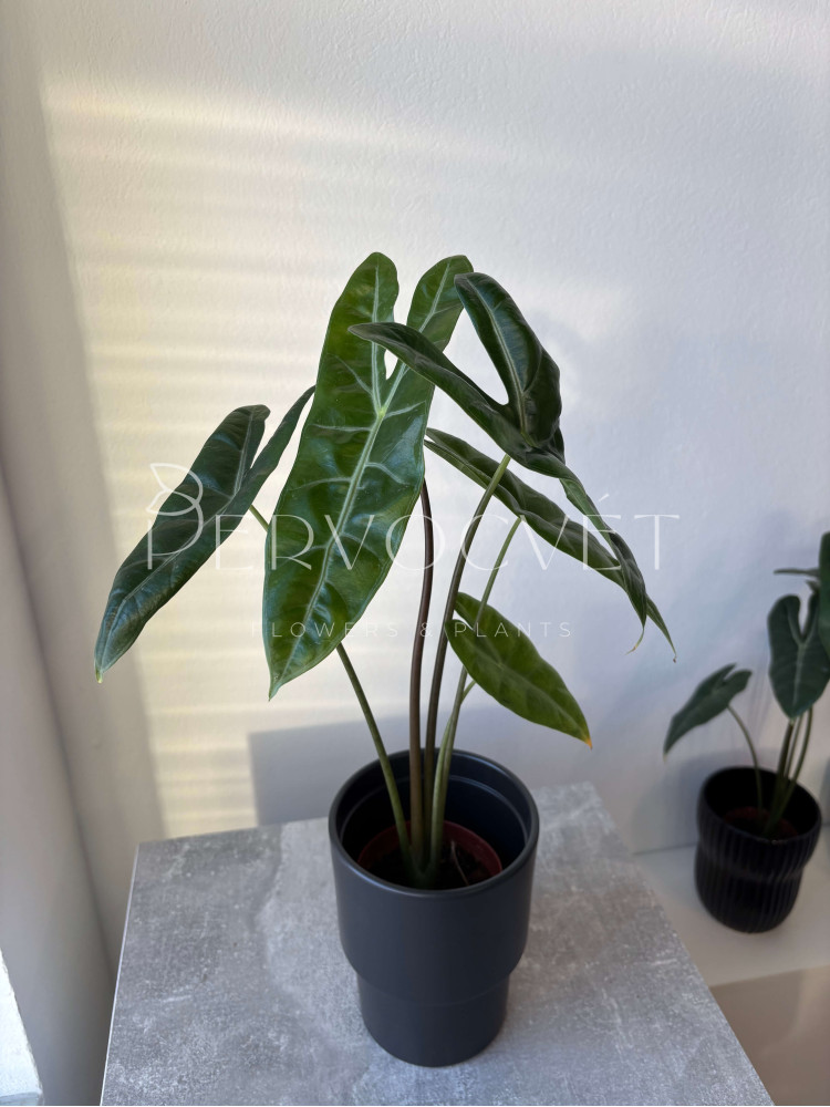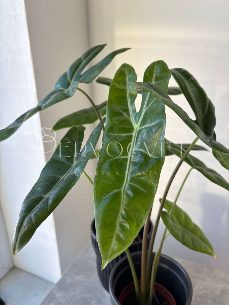 Алоказия Лонгилоба - редкий сорт Алоказий с крупными, глянцевыми, стреловидными листьями, на длинных черешках. Главная сортовая особенность - это рисунок жилок на листе зеленого цвета. Жилки часто белые, с серебристым оттенком, у некоторых сортов с возрастом проявляется пурпурность обратной стороны листа. Растение как из Пинтерест. Про уход читайте ниже.