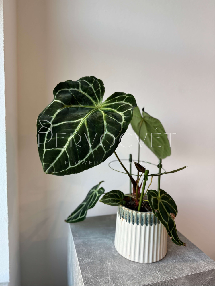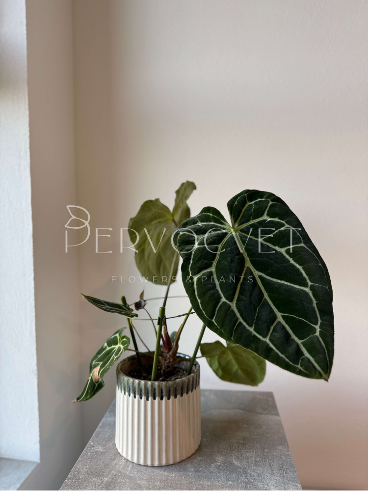 Горшок подбирайте из натуральных пористых материалов, влаго- и воздухопроницаемых: терракота, керамика, глина. Тесные = по размеру корневой системы, не "на вырост". Считается что классическая конусовидная форма, с сужением книзу - идеальна для декоративно-лиственных антуриумов. Также можно выращивать растение в двух горшках: прозрачный пластиковый горшок, в котором непосредственно "сидит" растение, и декоративный горшок, который в свою очередь будет сберегать тепло - таким образом вы сможете контролировать состояние корней и эффективность полива. Пересадку лучше всего запланировать с марта по сентябрь, и только в случае если корни заполнили весь грунт и нужен горшок побольше. Субстрат должен быть рыхлый, пористый, с влагоемкими компонентами. Вы можете использовать готовую смесь для орхидей, но добавить в нее глиняный гранулят, кокос. Идеальный грунт: 1:1:1 из торфа или кокоса, смеси для орхидей и агроперлита.