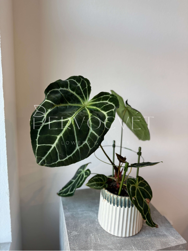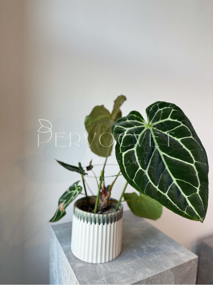 Антуриум Хрустальный - дикий сорт, обитатель тропиков Панамы и Колумбии, семейства Ароидных, внешне очень схож с алоказиями. Выращивается как декоративно-лиственное растение, хотя цветение также происходит необычным соцветием-початок. Листья сердцевидные и темно-зеленые с рисунком, на ощупь бархатистые и плотные. Снизу листья светло-зеленые, а рисунок ярко выражен. Растение относится к прихотливым растениям, которые требуют системы в уходе (читайте ниже про уход).