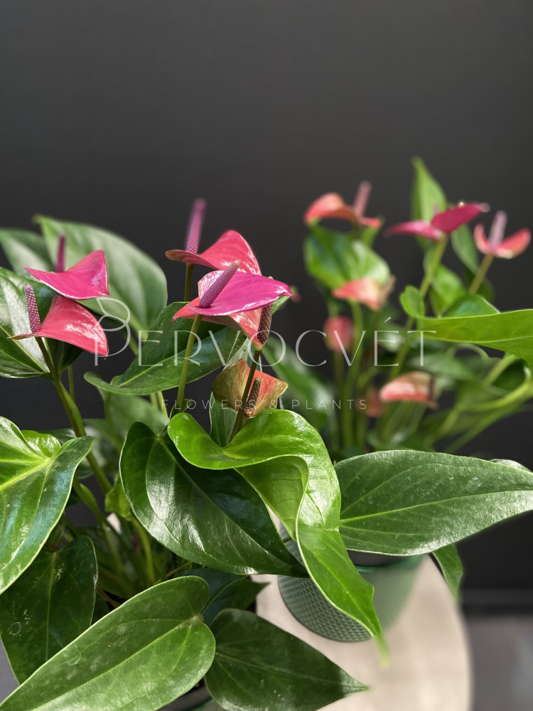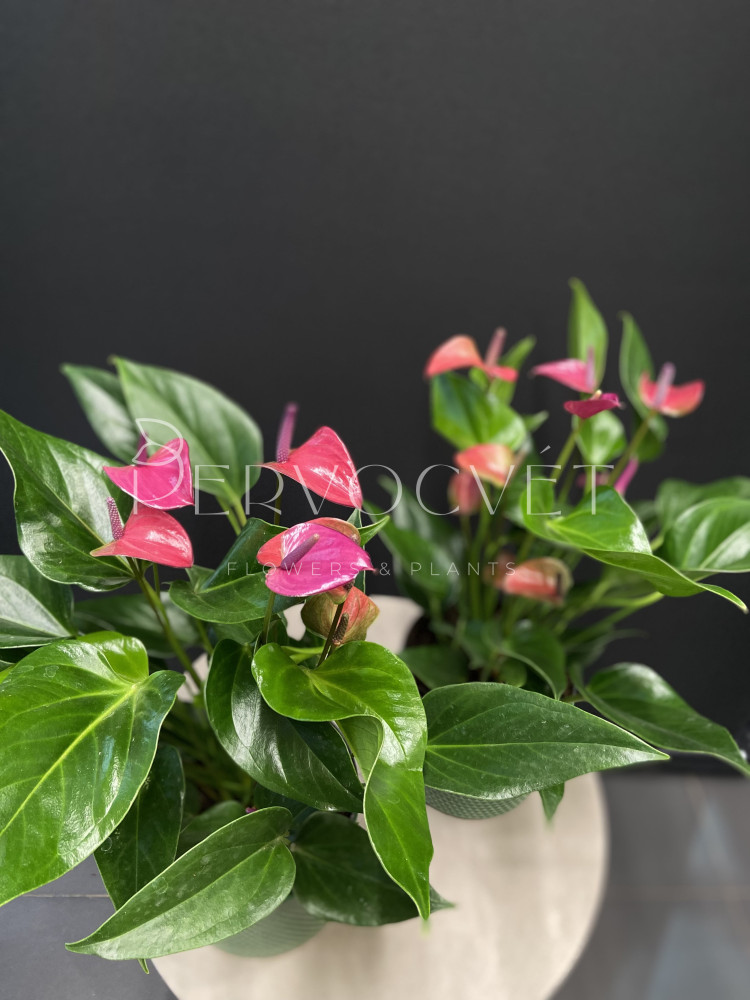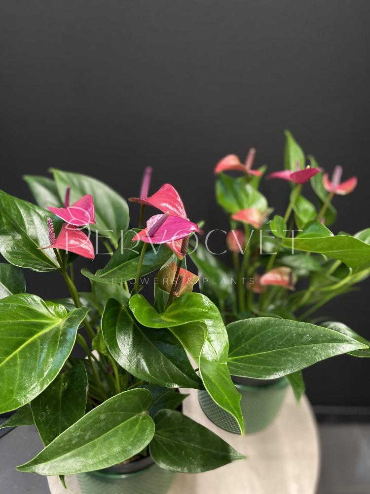 Антуриум Сирано - изящный тропический многолетник. Растение компактное, предназначается для комнатных условий. Цветки розово-бордового цвета с покрывалом зауженной формы. При соответствующем уходе сорт Сирано цветет круглый год.