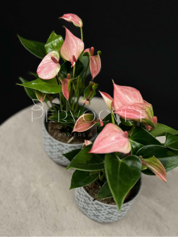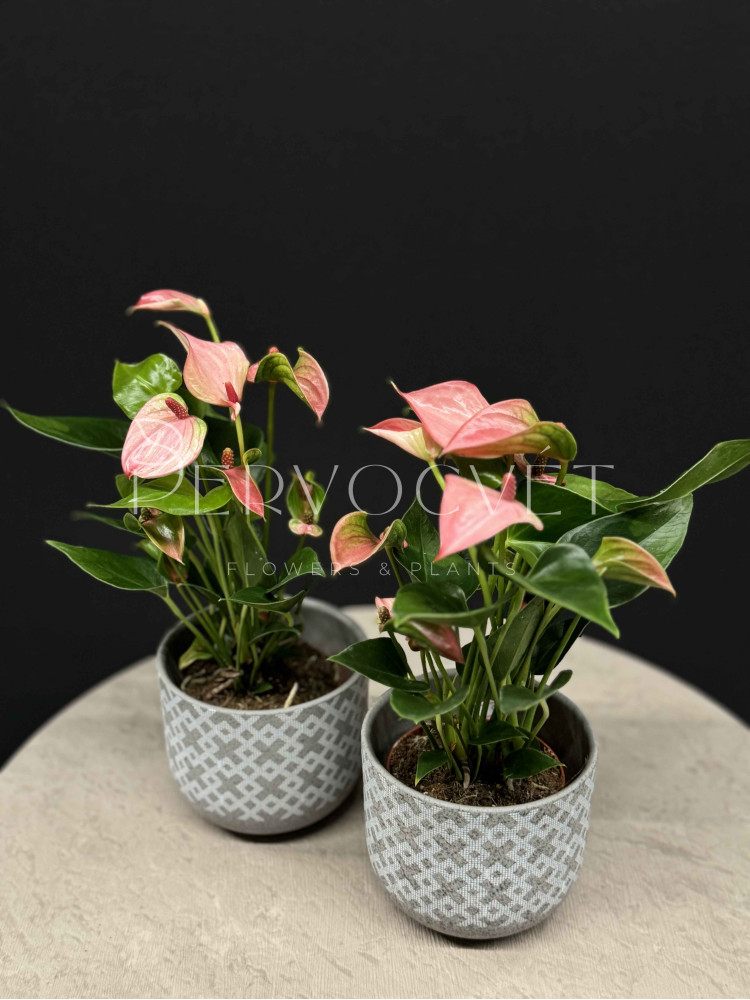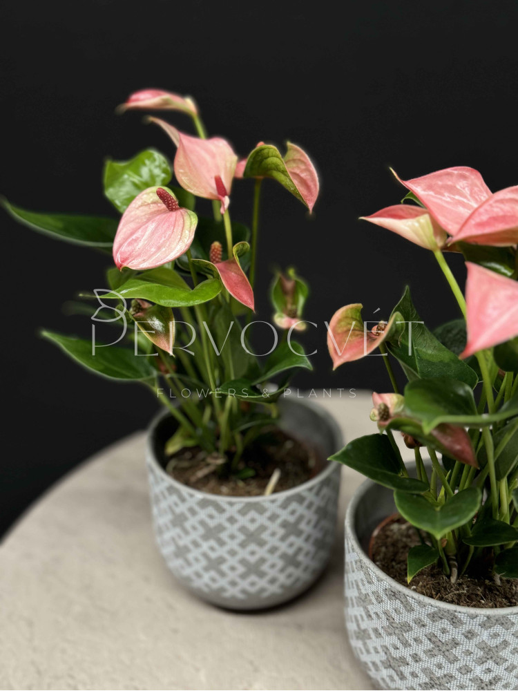 Антуриум Матата - редкий сорт антуриума с двойным покрывалом у цветков. Оттенок покрывала розовый (лососевый) с переходом к зелёному через белый цвет. Размер покрывала до 10 см, растение компактного роста.