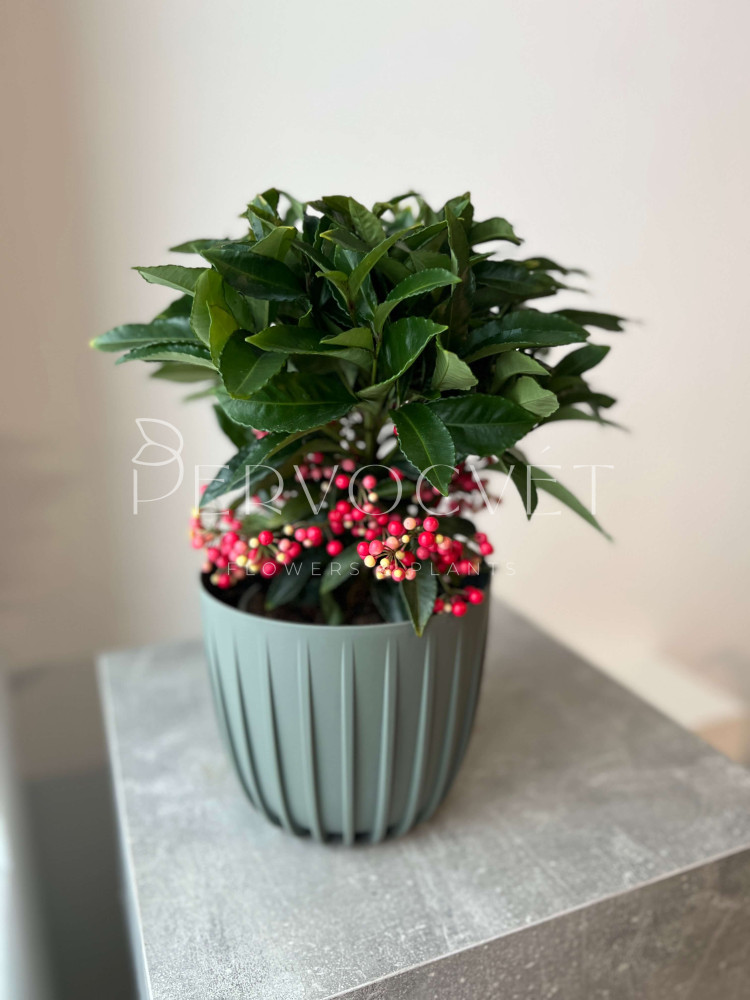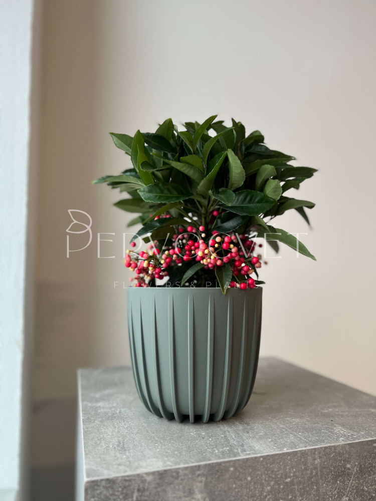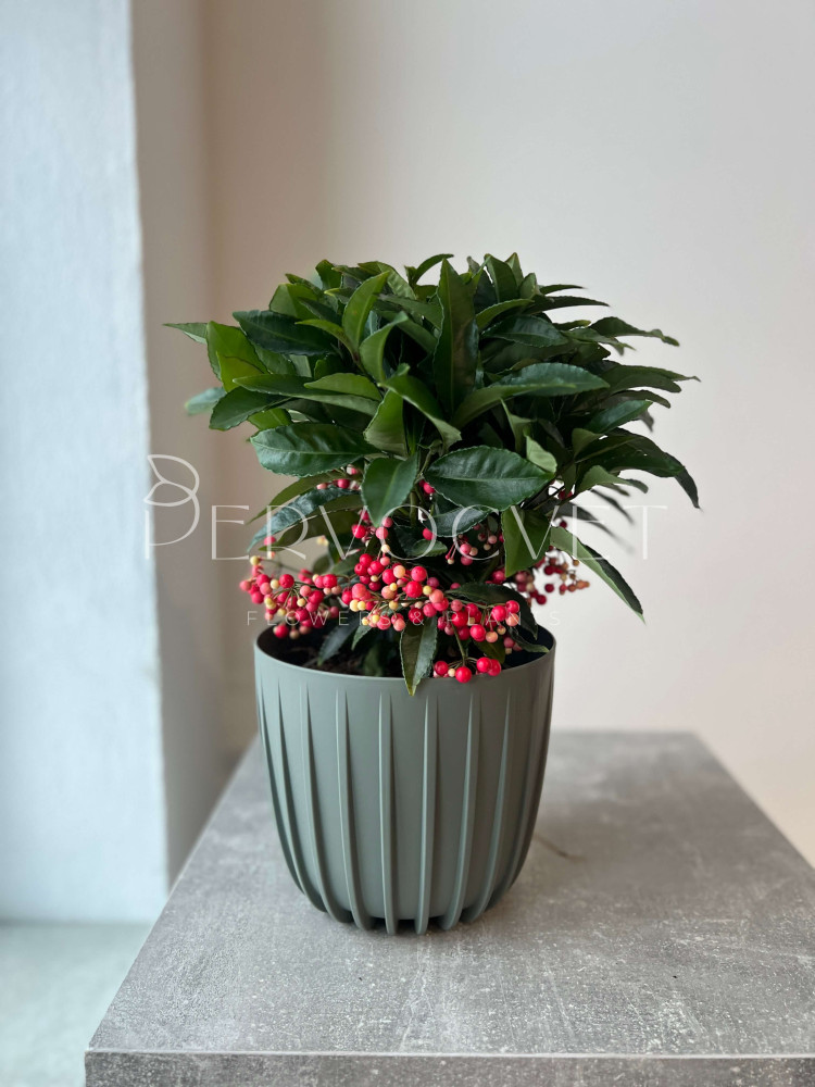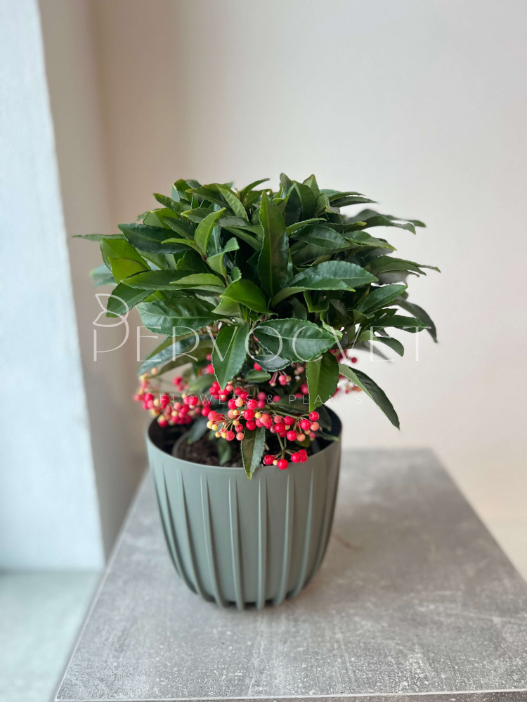 Ардизия Городчатая - миниатюрное экзотическое одноствольное деревце с густой кроной (или компактный куст), представитель семейства Мирсиновые. Традиционно известное как Рождественская ягода или Коралловое дерево. Особую ценность представляют плоды, которые способны оставаться на растении до следующего цветения, из-за чего ардизия круглый год не теряет привлекательность.