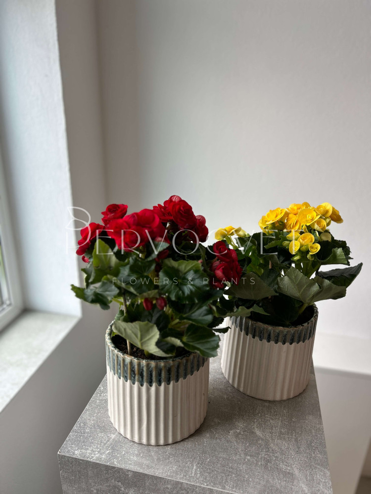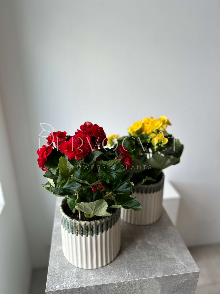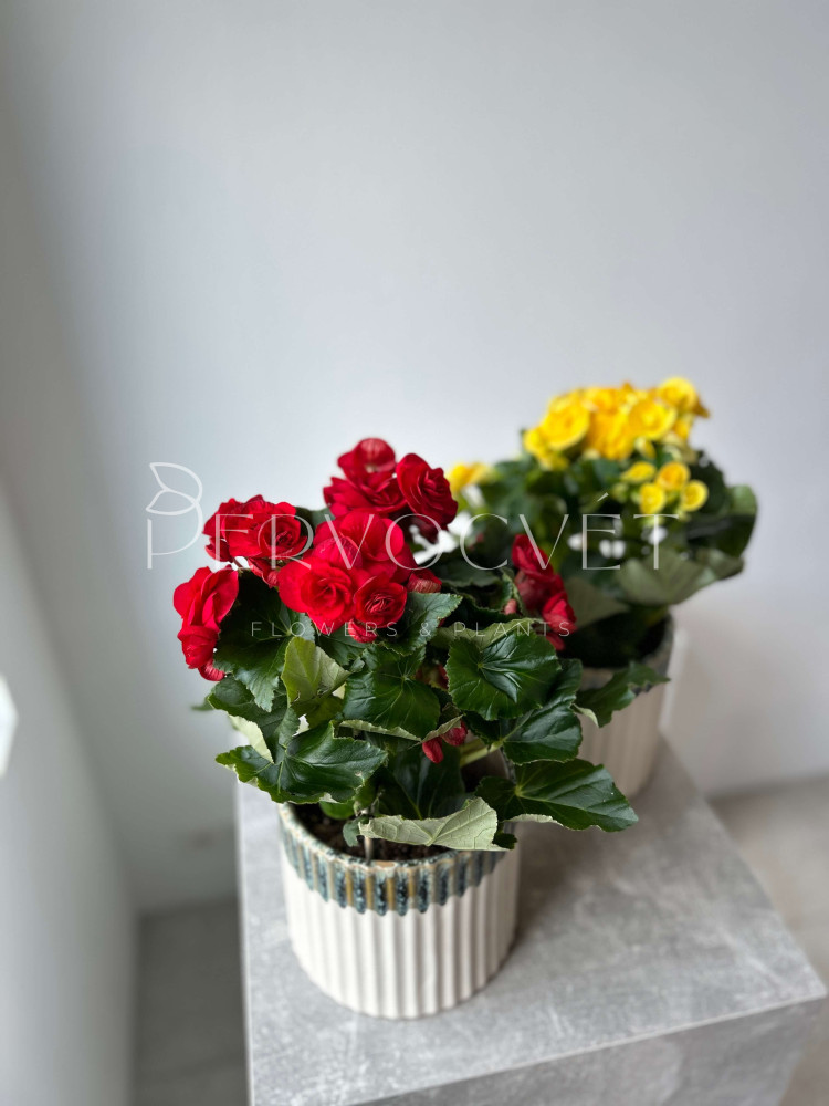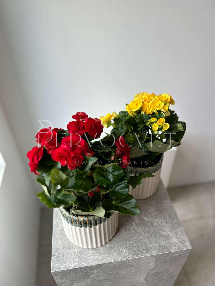 Бегония - красивоцветущее комнатное растение, выведена путем скрещивания 7 видов. Представлено с махровыми и простыми цветками различного окраса. Растение неприхотливое, но нуждается в регулярном омоложении, т.к. отличается быстрым ростом (за год становится в 3 раза больше). Цветение наблюдается в течение всего года, кроме зимних месяцев.