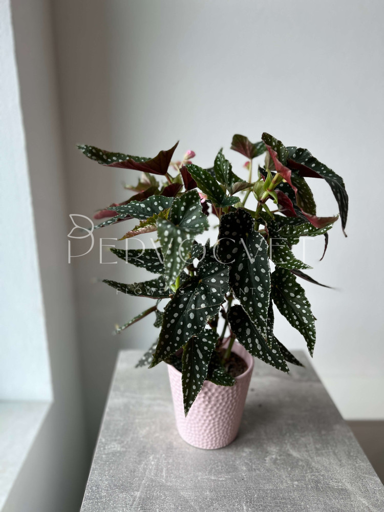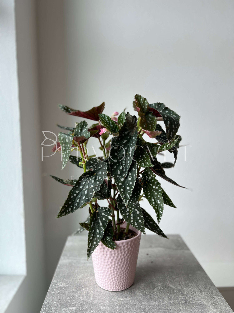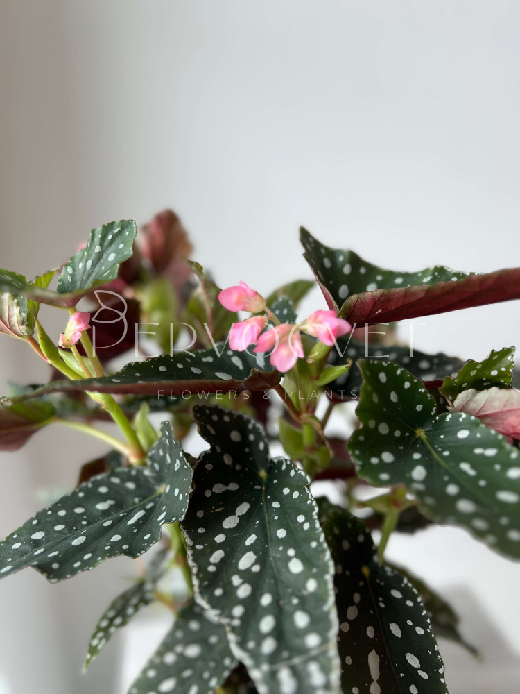 Бегония Макулата - группа декоративно-лиственных пятнистых бегоний. Сорт Спотлайт Грин отличается быстрым ростом вширь, уникальными листьями с множеством оттенков (контрастный красно-бордовый низ листа и серо-зеленый пятнистый верх) и вытянутой формой, настоящий акцент в интерьере. При этом абсолютно неприхотливый сорт, который периодически радует цветами. Про уход читайте ниже.