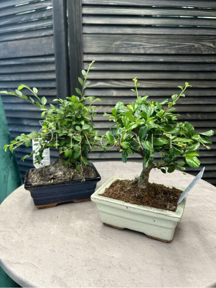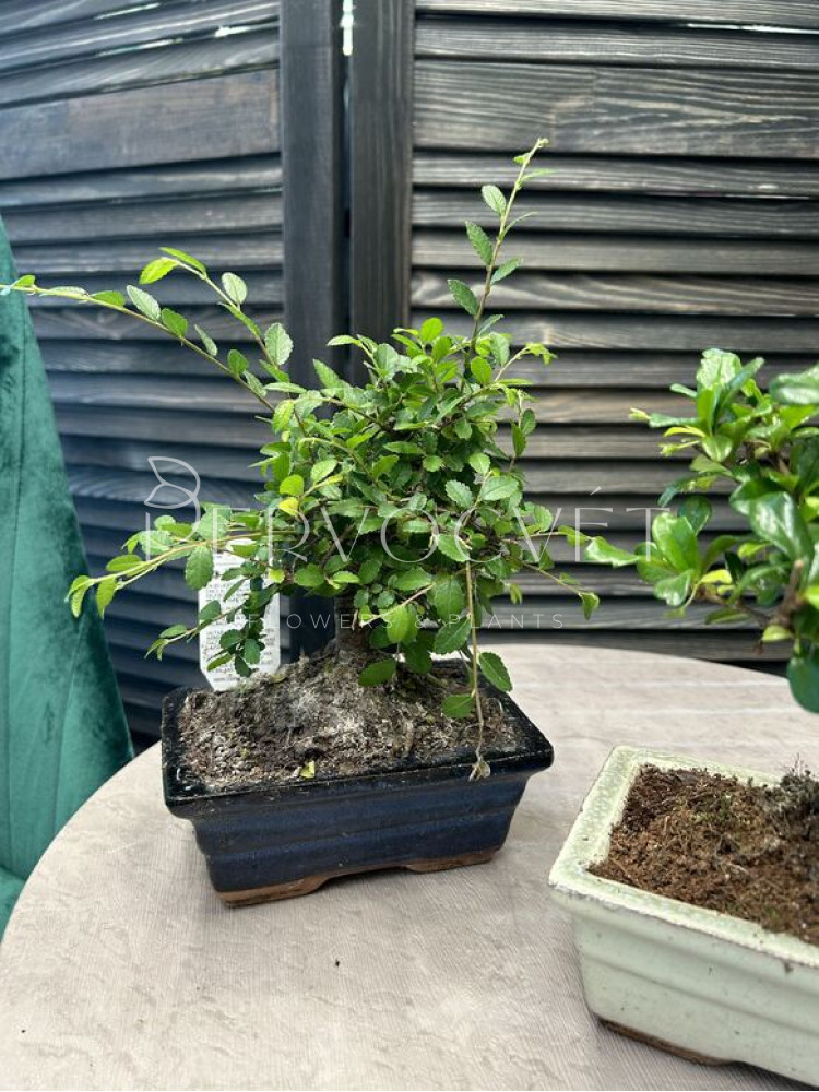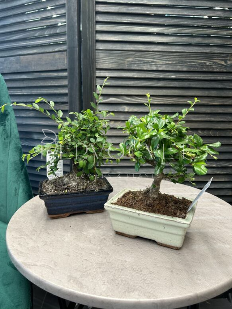Миниатюрное дерево по технике "Бонсай" в квадратном кашпо. Требует заботливого ухода: формирование кроны, ствола, пересадки. Но при этом развивается практически в любых условиях.