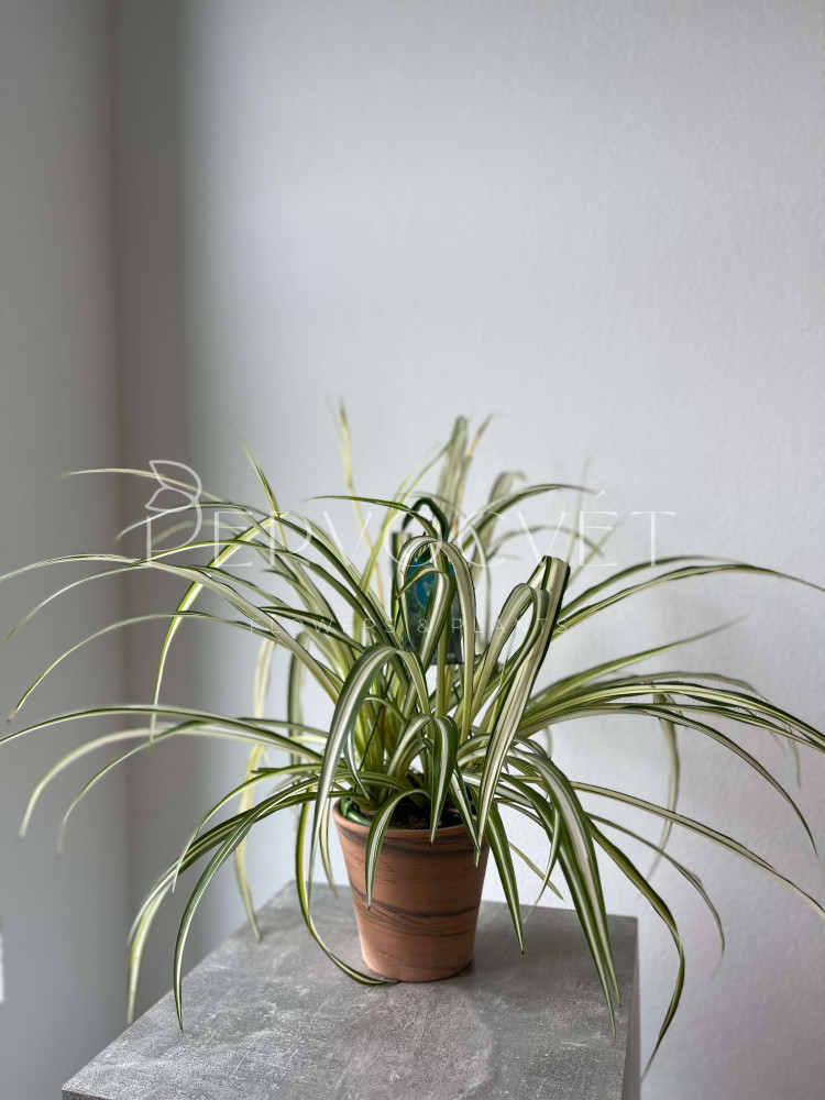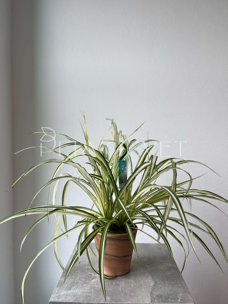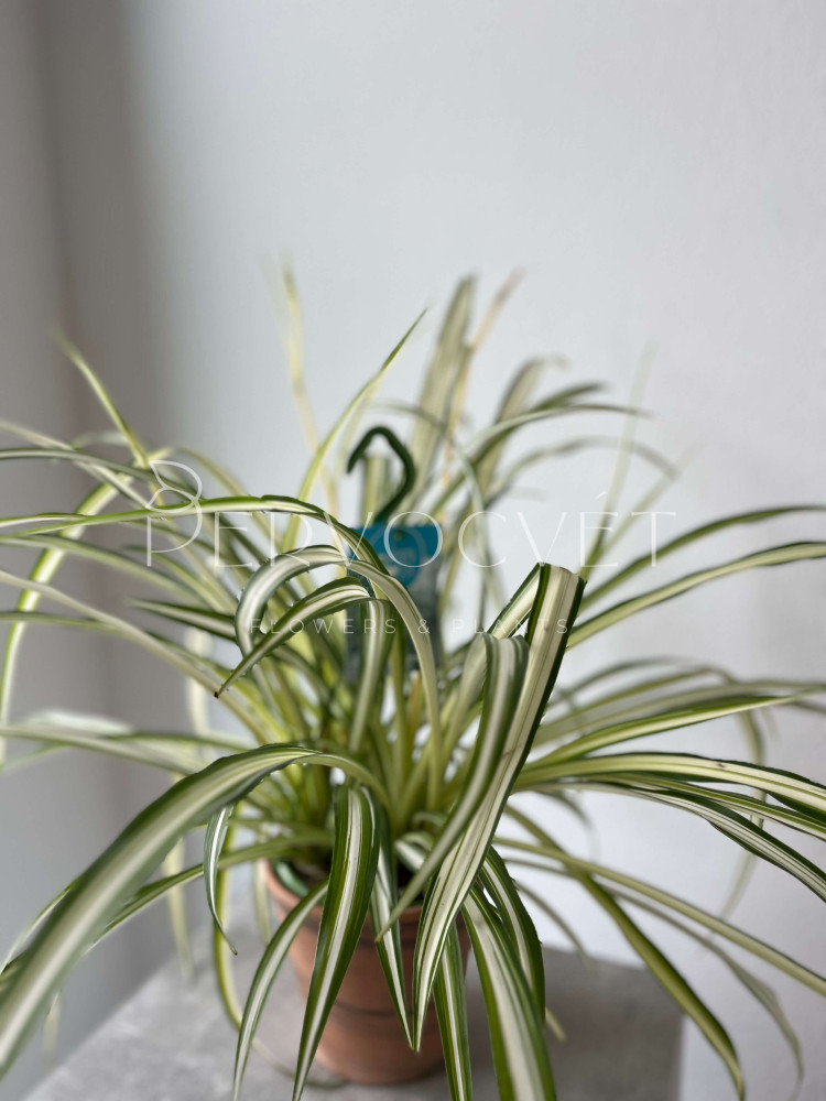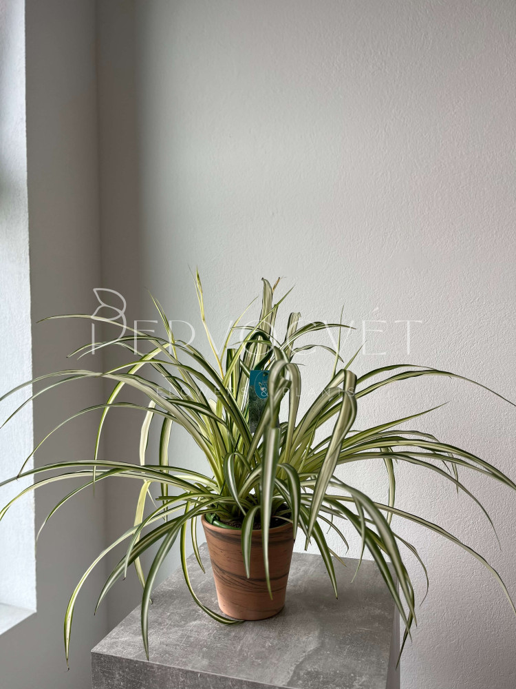 Хлорофитум - часть семейства Спаржевые, наиболее неприхотливое комнатное растение, которое также очищает воздух в помещении. При этом растение цветет и обладает высокой декоративностью. Хлорофитум Витатум отличается пышной кроной пестрых почти белесых листьев, которые создают объемную раскидистую шапку.