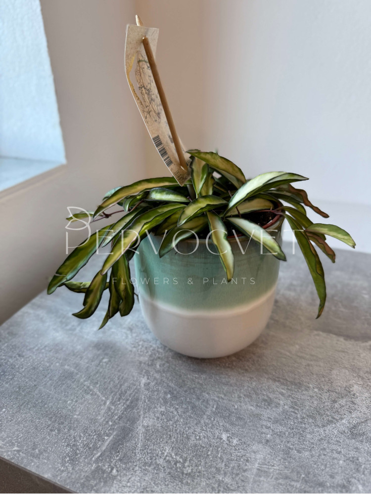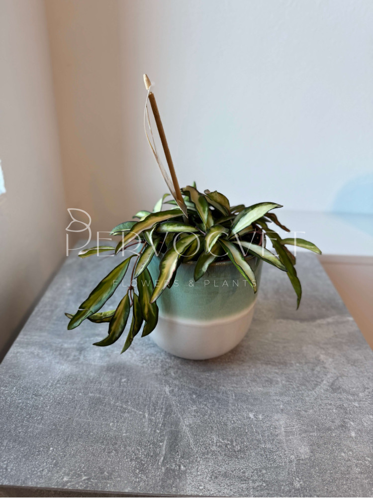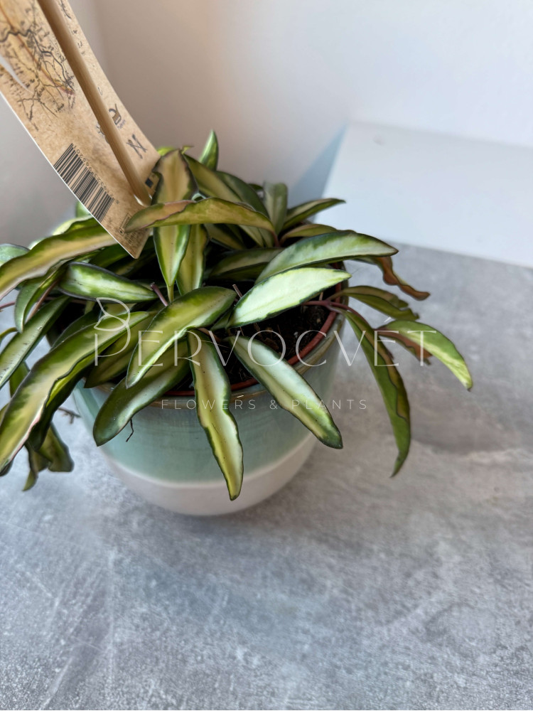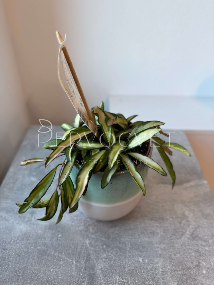 Хойя Вайети Триколор - редкий сорт вариегтаной хойи с трехцветной окраской! Кремовый, зеленый и розовый оттенки листьев нуждаются в достаточном количестве света. Листья слегка волнистые, жесткие и длинные, могут достигать 20 см каждый. Ценится за декоративность и ароматное цветение, и особенно - за ампельный рост! Идеальное растение-украшение для создания "зеленого" ниспадающего акцента. Про уход читайте ниже.