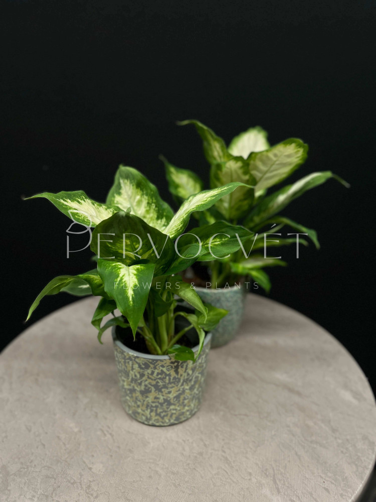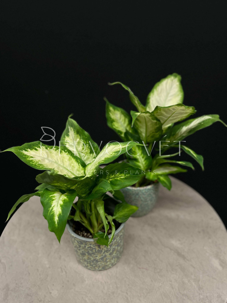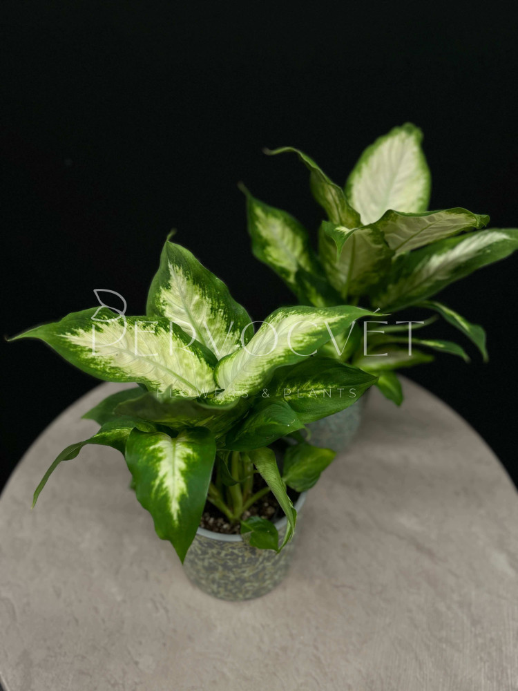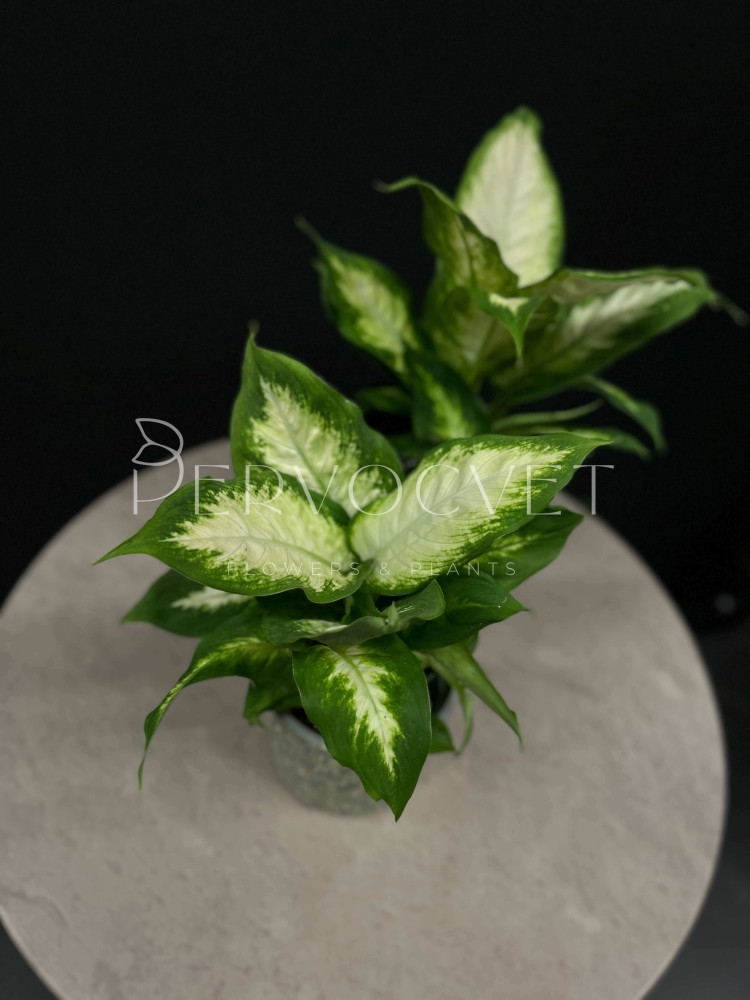 Диффенбахия Камилла - декоративно-лиственное растение с кремово-салатовыми листьями с зеленой каймой. Длина листьев может достигать 20см. Вечнозеленые необычные сорта неприхотливы в выращивании.