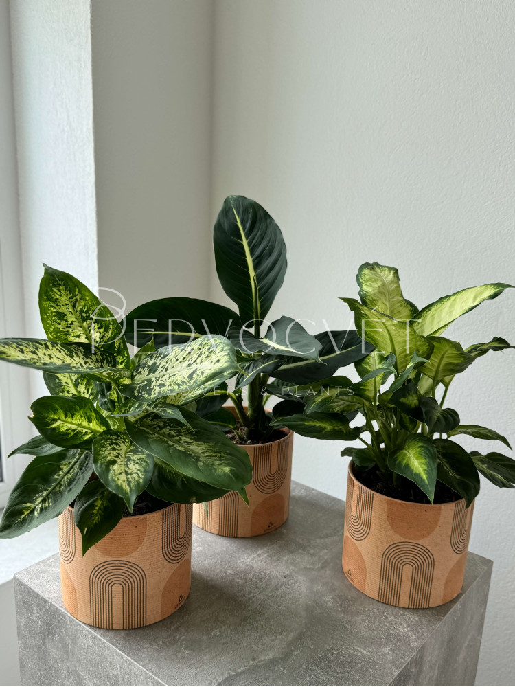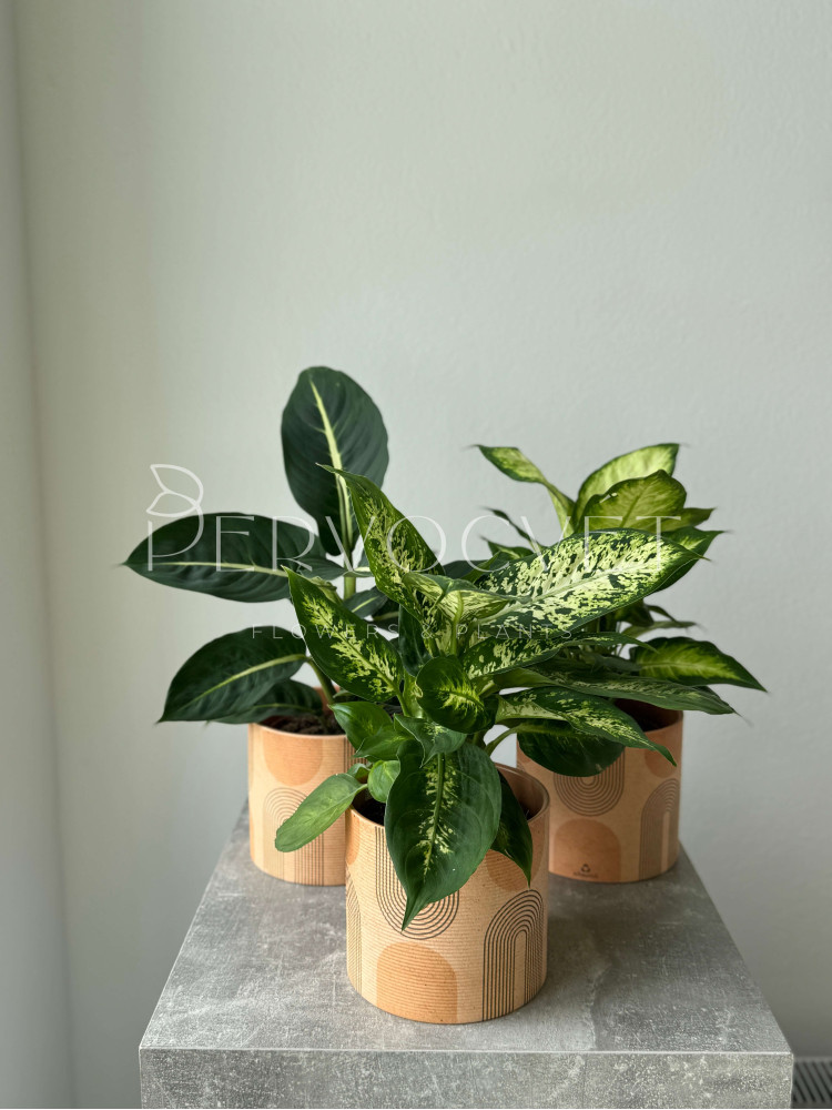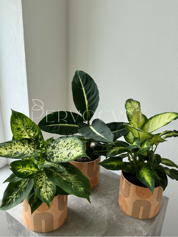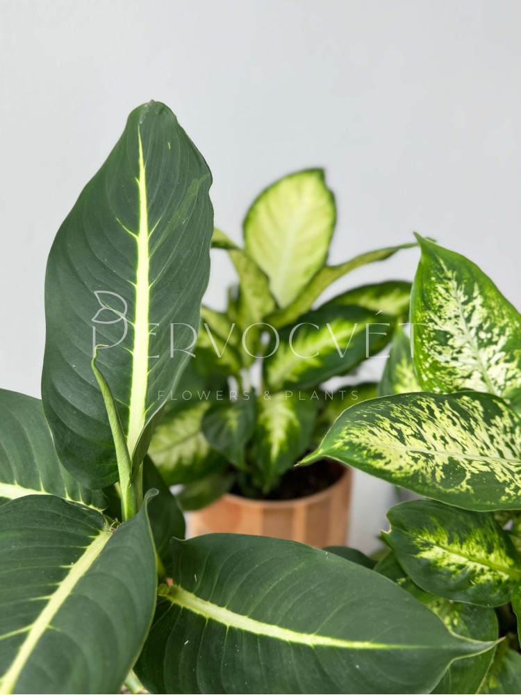 Диффенбахия - декоративно-лиственное растение с пятнистыми листьями, с множеством оттенков от кремового до темно-зеленого. Максимальный рост до 3х метров. В домашних условиях цветет редко, ценится за высоко декоративную листву. На фото микс сортов, наши менеджеры обязательно пришлют вам фото, если вы захотите выбрать определенный экземпляр. Информацию об уходе читайте ниже.