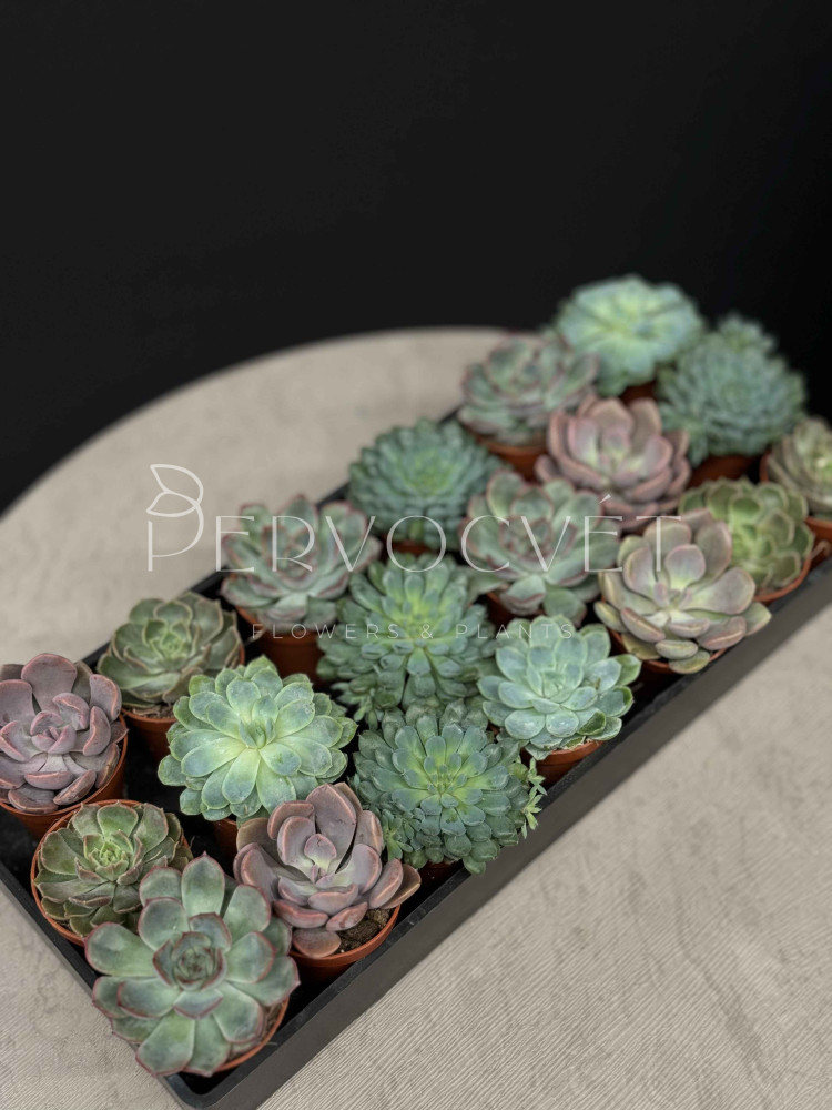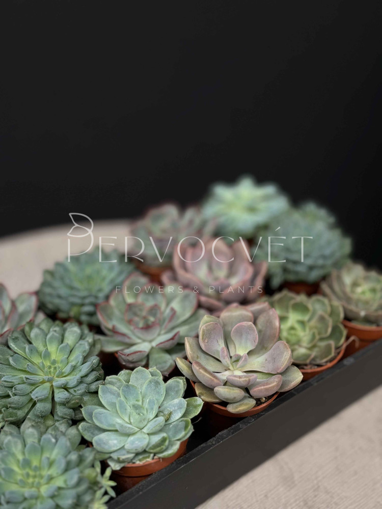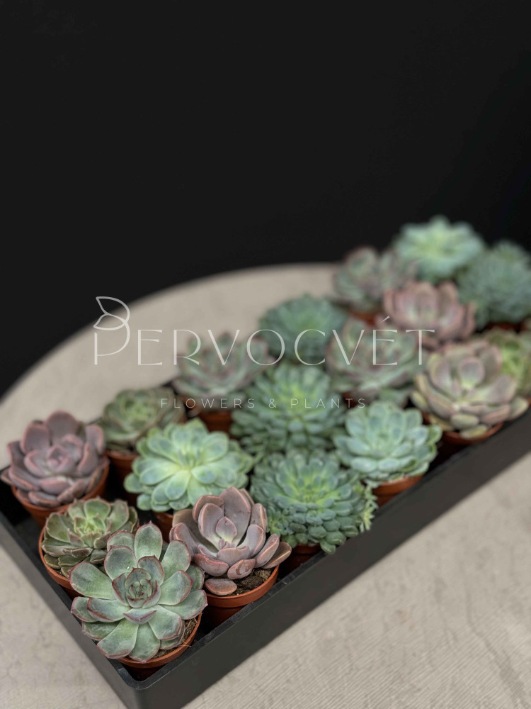 Микс из мини Эхеверий включает в себя (ряды сверху вниз на первом фото): Эхеверия Изящная, Багряная (Пурпузорум), Горбатоцветковая, Пулидонис, Деренберга.