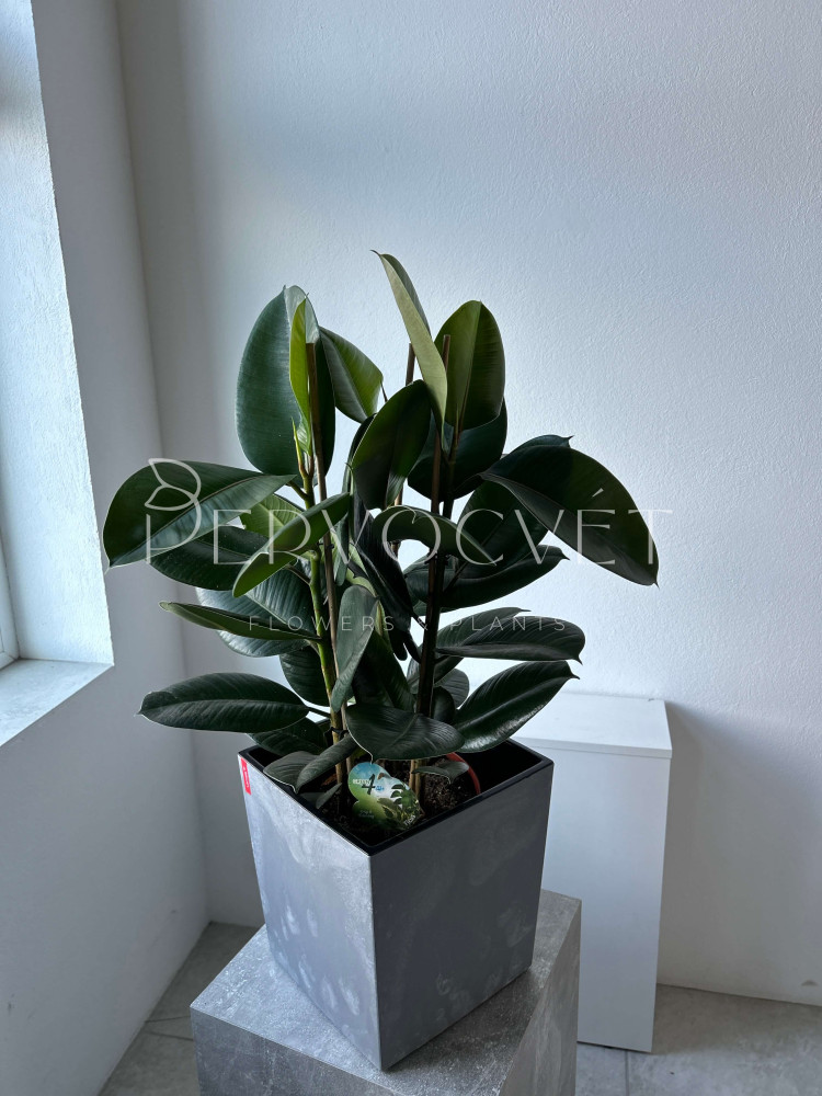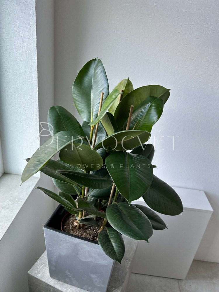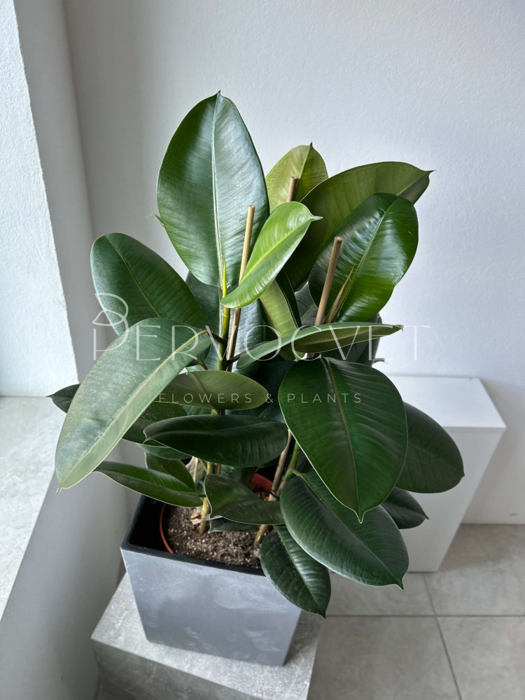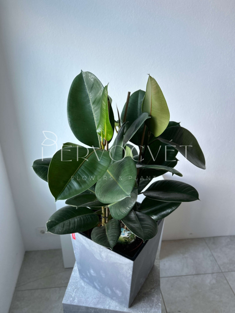 Фикус Эластика - вечнозеленое растение, представитель южновосточной Азии. Отлично смотрится в любом интерьере, в т.ч. в офисе. Ранее дикие представители использовались как источники каучука. Фикус Робуста отличается тёмно-зелёной природной глянцевой окраской листьев крупных листьев.