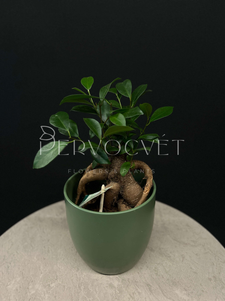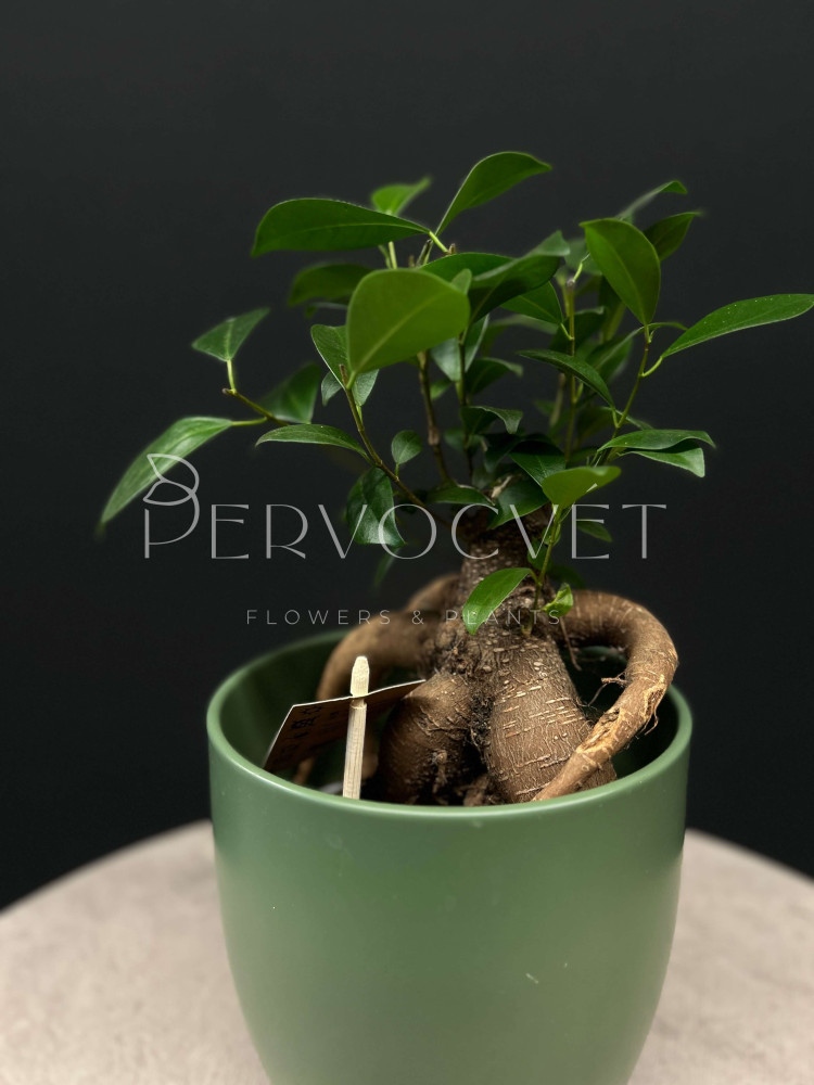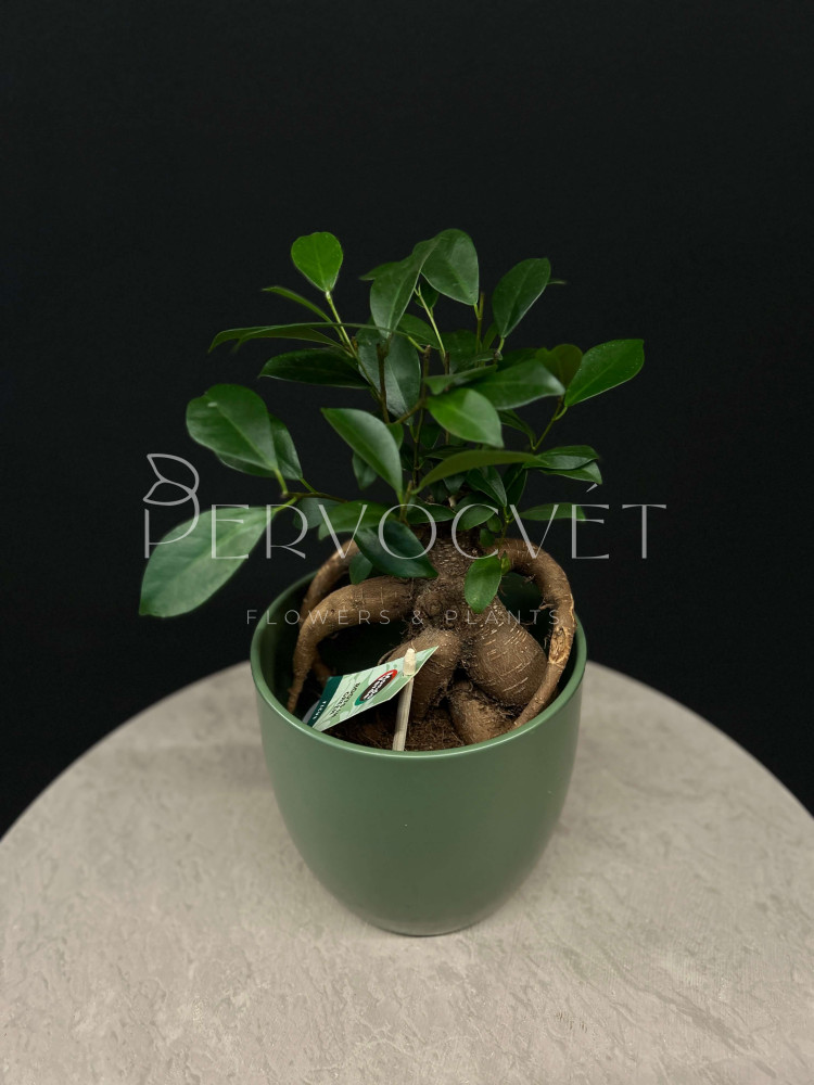 Фикус Микрокарпа Гинсенг - миниатюрное дерево по технике "Бонсай", изящный и удивительный Гинсенг. Представитель семейства Тутовые, в домашних условиях вечнозеленый кустарник не вырастает выше 50 см. С латыни название переводится как "женьшень", такое название фикус получил благодаря схожести корневой системы с корнем женьшеня, который также напоминает "мандрагору", использовавшуюся в средние века в магических ритуалах.