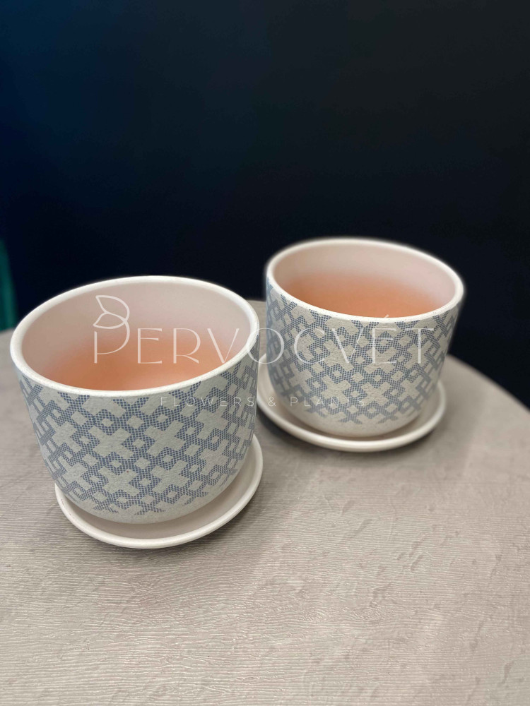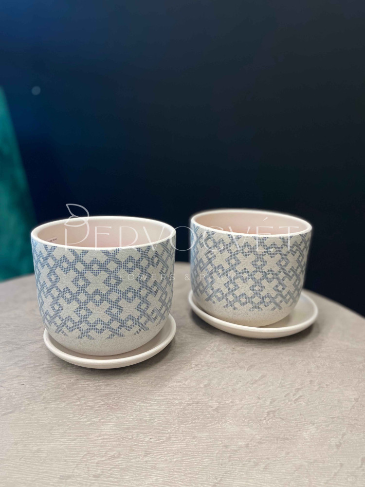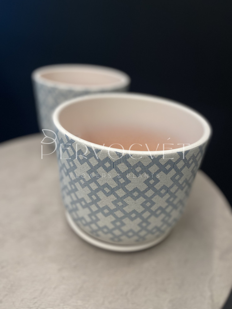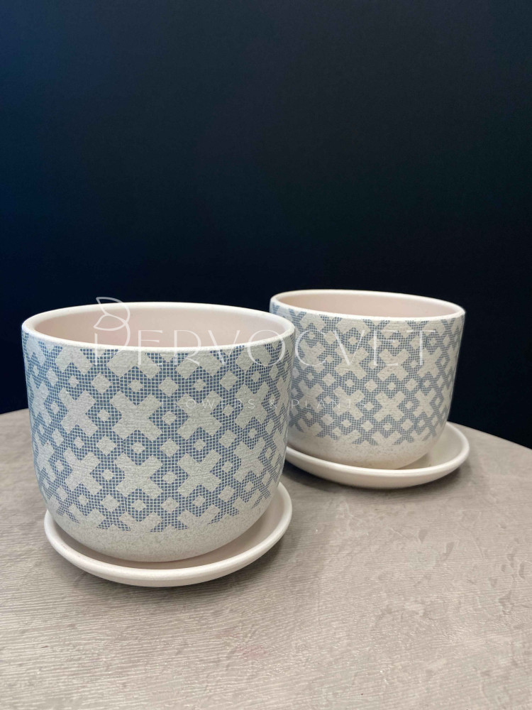 Характеристики: керамический горшок с блюдцем, с рисунком мозаики Кросс Бук, голубой узор на белом фоне