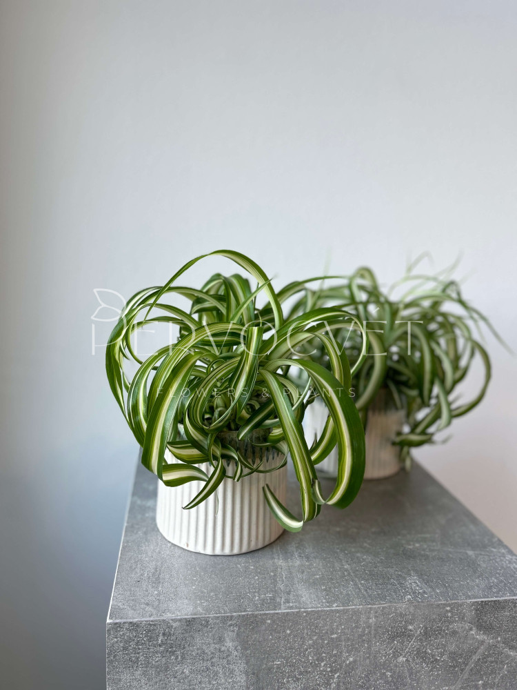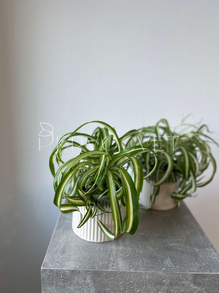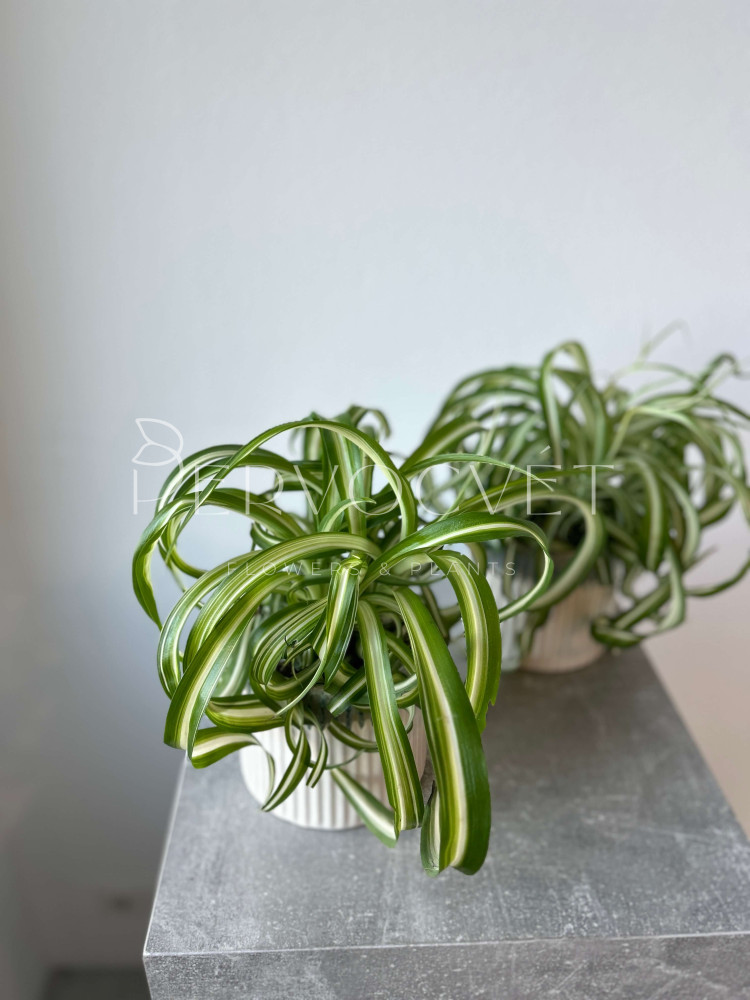Хлорофитум - часть семейства Спаржевые, наиболее неприхотливое комнатное растение, которое также очищает воздух в помещении. При этом растение цветет и обладает высокой декоративностью. Хлорофитум Бонни, или кучерявый, отличается пышной волнистой кроной, листья закручиваются вокруг кашпо, создавая объемную шапку.