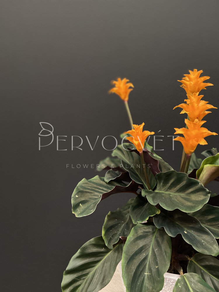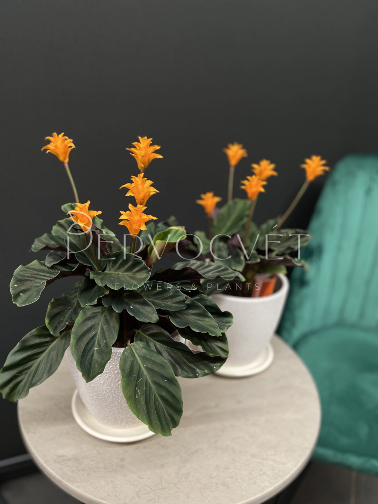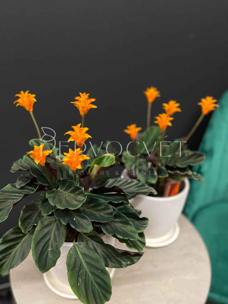 Калатея Кроката - многолетнее цветущее растение, удивительный сорт, который ценится как за бордово-шоколадную листву, так и за ярко-оранжевые цветы. Другое название - Калатея Шафранная, относится к семейству Марантовые. Сорт Кроката весьма компактный (40-45 см в высоту) и хорошо адаптированный к домашним условиям.