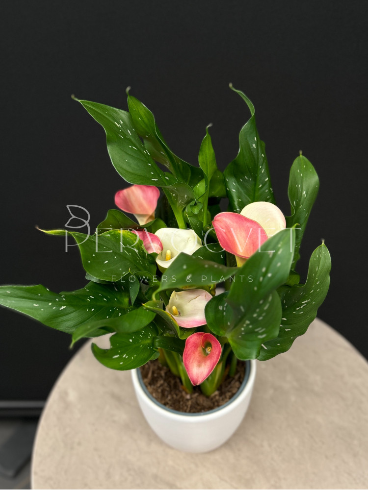 Калла - совершенный цветок, который в переводе с греческого означает "красивый". Каллы часто используют для создания свадебных букетов, но также растение можно успешно содержать как горшечное дома. Предпочитает балконы и помещения со свежим воздухом, но без сквозняков.