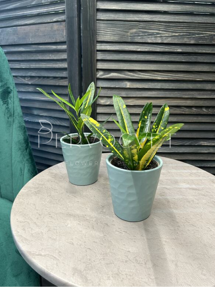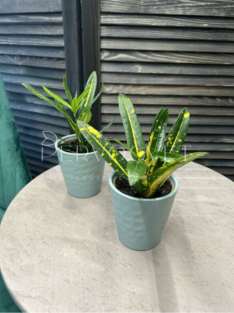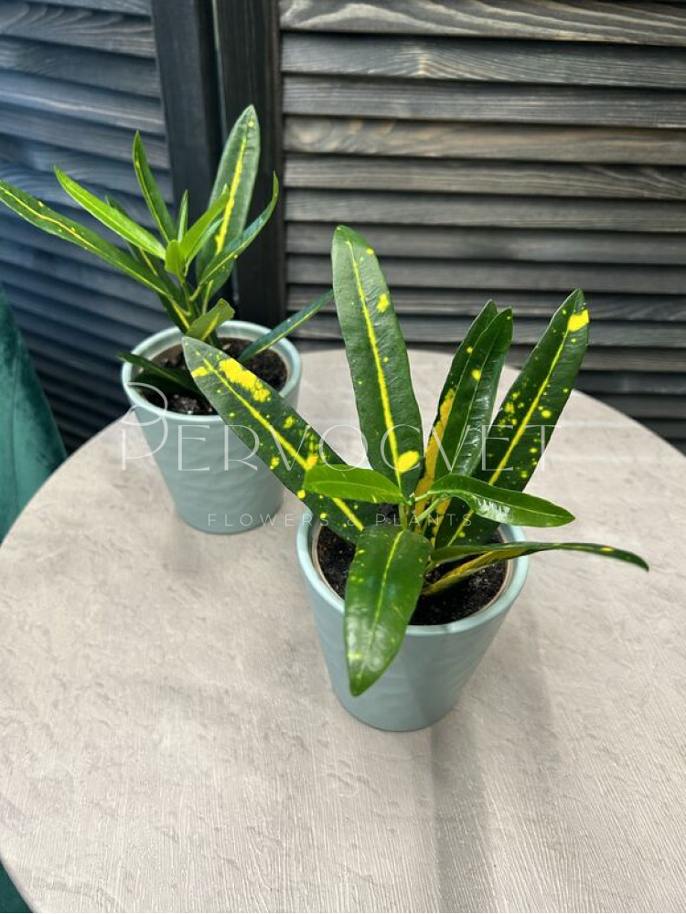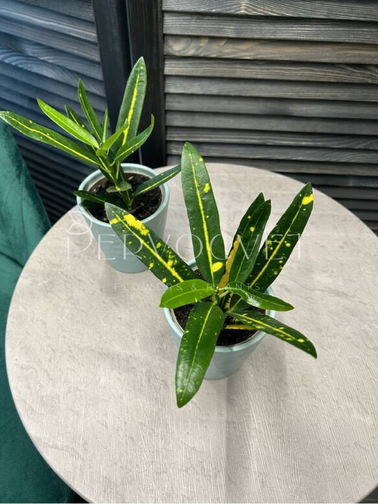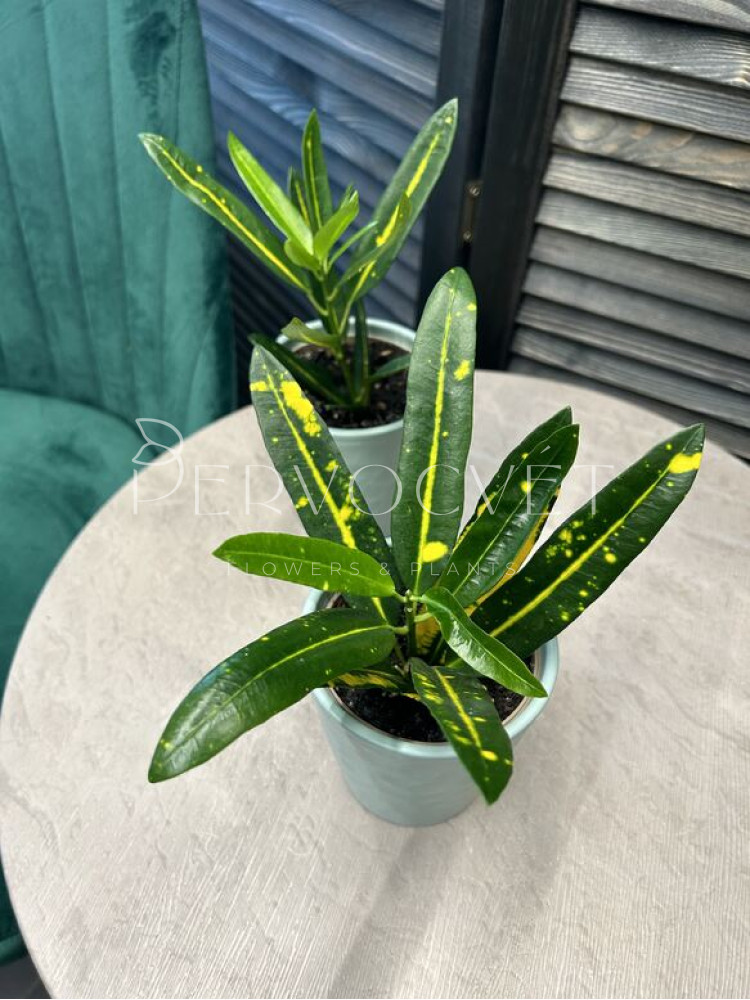 Кодиеум (Кротон) Санни Стар - вечнозеленый кустарник семейства Молочайных. Санни Стар отличается сочным окрасом листвы: ярко-зеленая с солнечно-желтыми пятнами, форма листьев ланцетная и заостренная. Молодые листочки обычно более зеленые, но затем приобретают пятна.