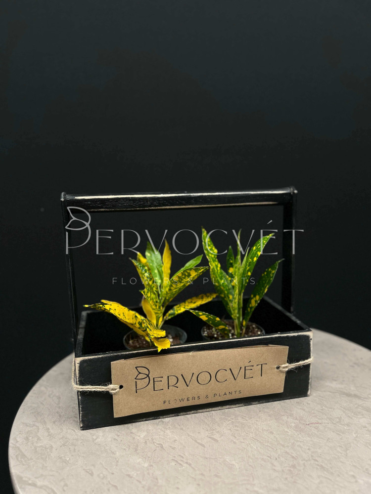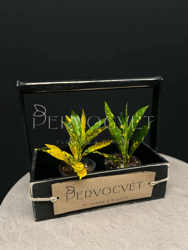 Кодиеум (Кротон) - вечнозеленый кустарник семейства Молочайных. Сорт Голд Сан (Gold Sun - "золотое солнце") - отличается вариегатностью листа с многочисленными вкраплениями яркого желтого цвета. Смотрится растение крайне эффектно и празднично, даже во взрослом возрасте вариегатность сохраняется и обильно покрывает все растение, данному сорту необходимо более яркое освещение и понадобиться досветка в зимнее время, без дополнительного света растение может потерять значительную часть желтой пятнистости !