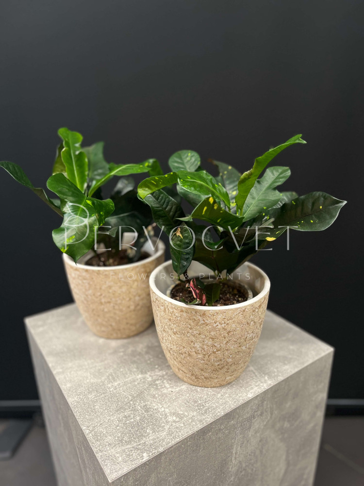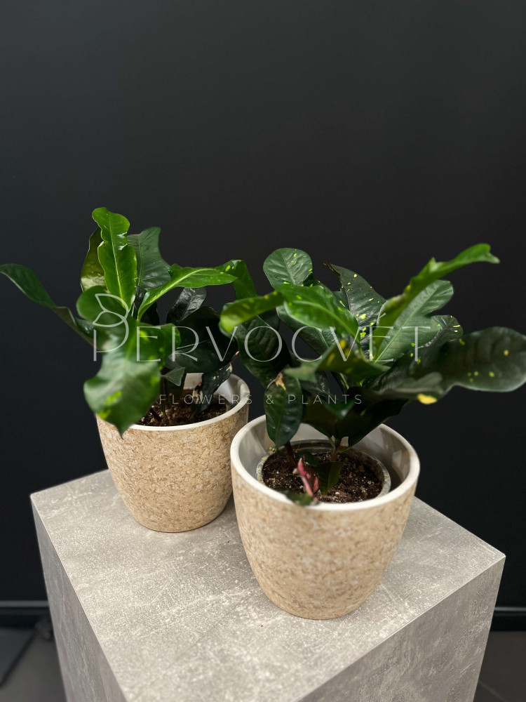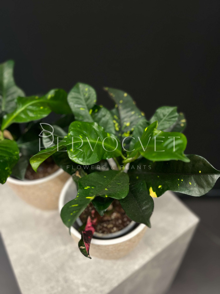 Кодиеум (Кротон) - вечнозеленый кустарник семейства Молочайных. Сорт Магнифисент - это самый яркоокрашенный кротон из всех, у растения пятна всех оттенков, от желтого до красного, на темно-зеленых листовых пластинах. Листья достигают размера 30 см, пятнистость в возрастом увеличивается. Пятна желтого, красного, оранжевого и розового цвета появляются по мере роста, а достигает растение нескольких метров в высоту !