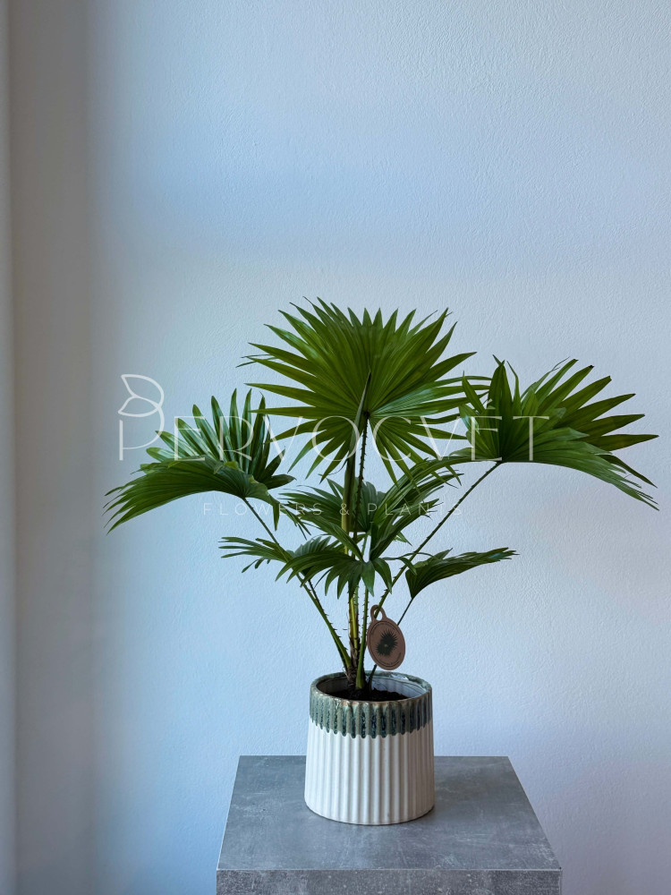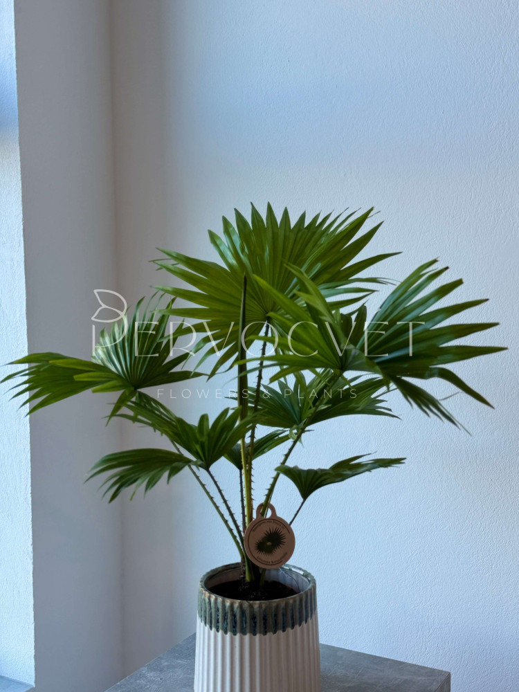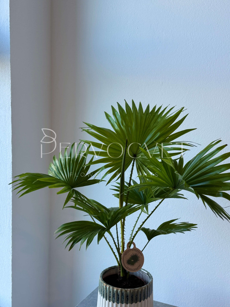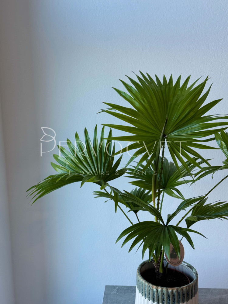 Ливистона Ротундифлолия, или Круглолистная, или Сарибус - это представитель настоящих пальм, растение котортое в природе достигает в высоту от 20ти метров. В домашних условиях обычно максимальная высота - 2 метра, поэтому предусмотрите достаточно пространства для ливистоны. Крупные веерообразные листья создадут атмосферу жаркого тропического отдыха, сами листья достигают в размере около 1 метра в диаметре. Не цветет в домашних условиях, выращивается как декоративно-лиственное растение, и ценится за крупный размер и неприхотливость в уходе (про уход читайте ниже).