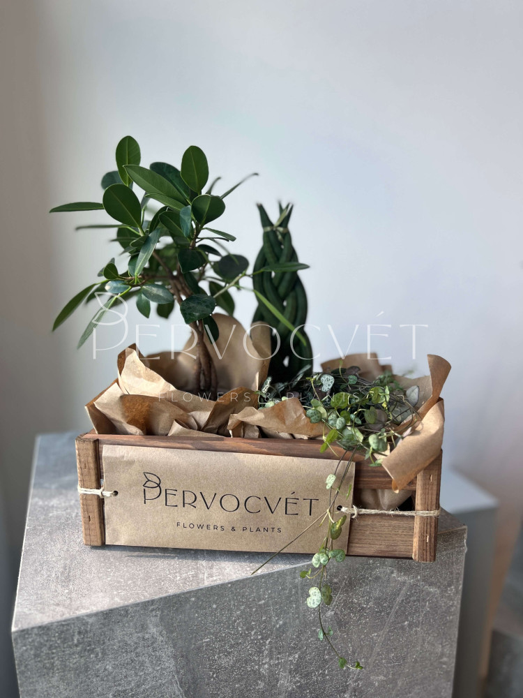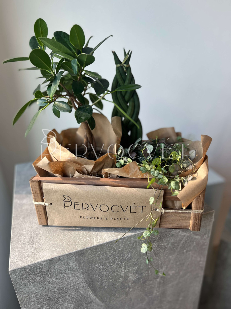 - Растения составлены в деревянный ящик в технических кашпо, дно проложено пленкой (к поливу нужно относиться аккуратно).