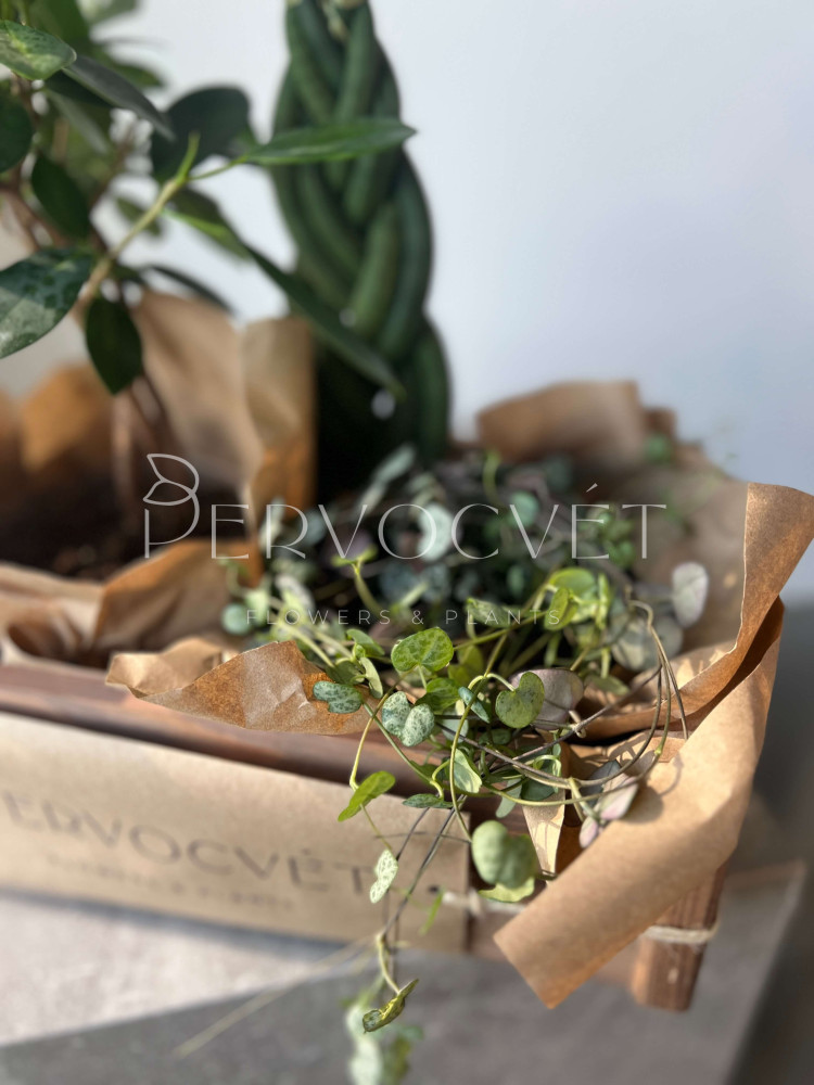 Растения: Церопегия Вуди 30 см, Фикус Майя с переплетенным стволом 40 см, Сансевиерия Косичка 30 см