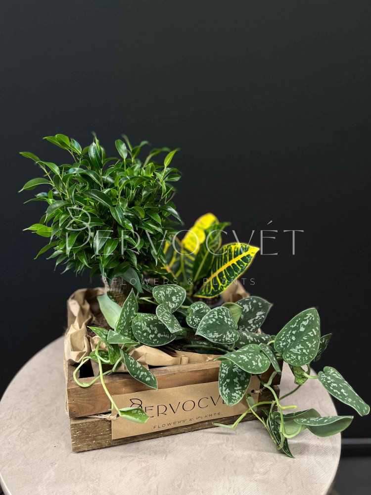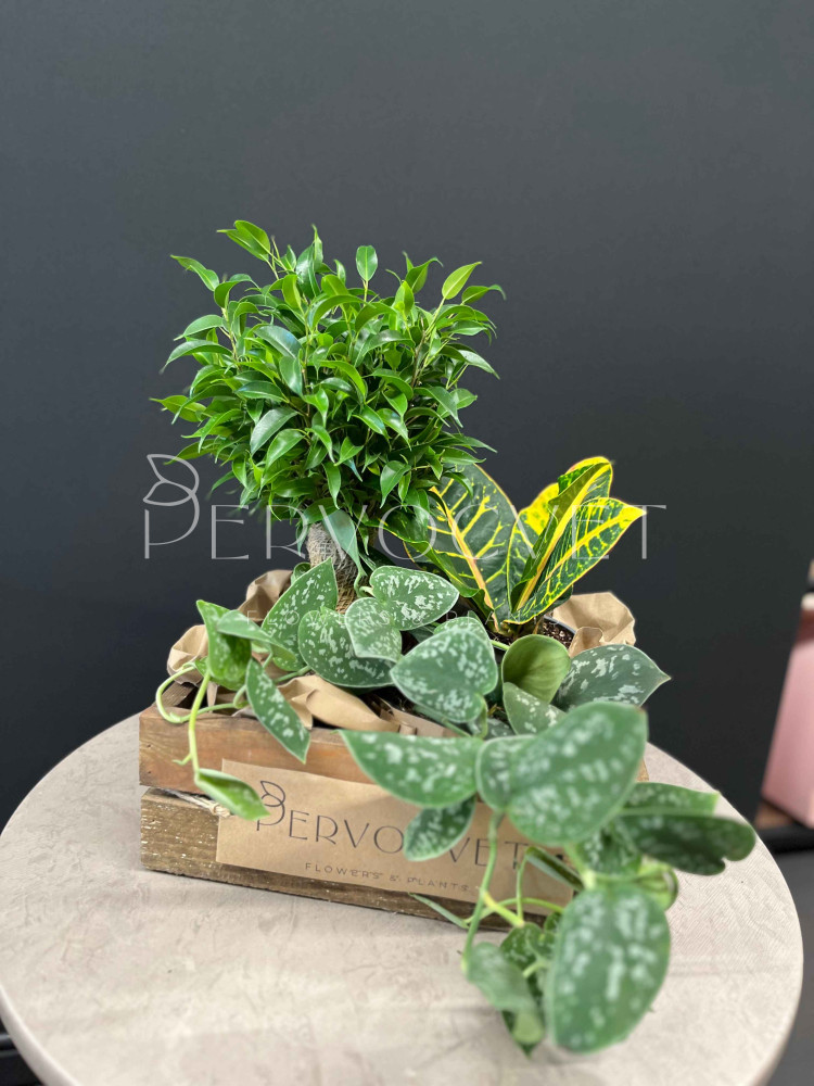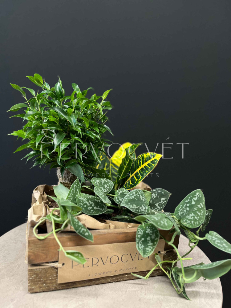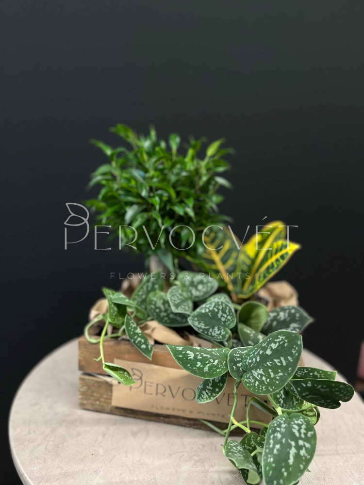В цветочный набор входят фикус сорта Наташа с пышной кроной, разноцветный Кодиеум Петра и ампель Сциндапcус Аргиреус. Идеально в качестве подарка любителю растений, подойдет к любому интерьеру: дом, офис, кофейня, другое.