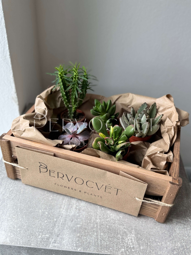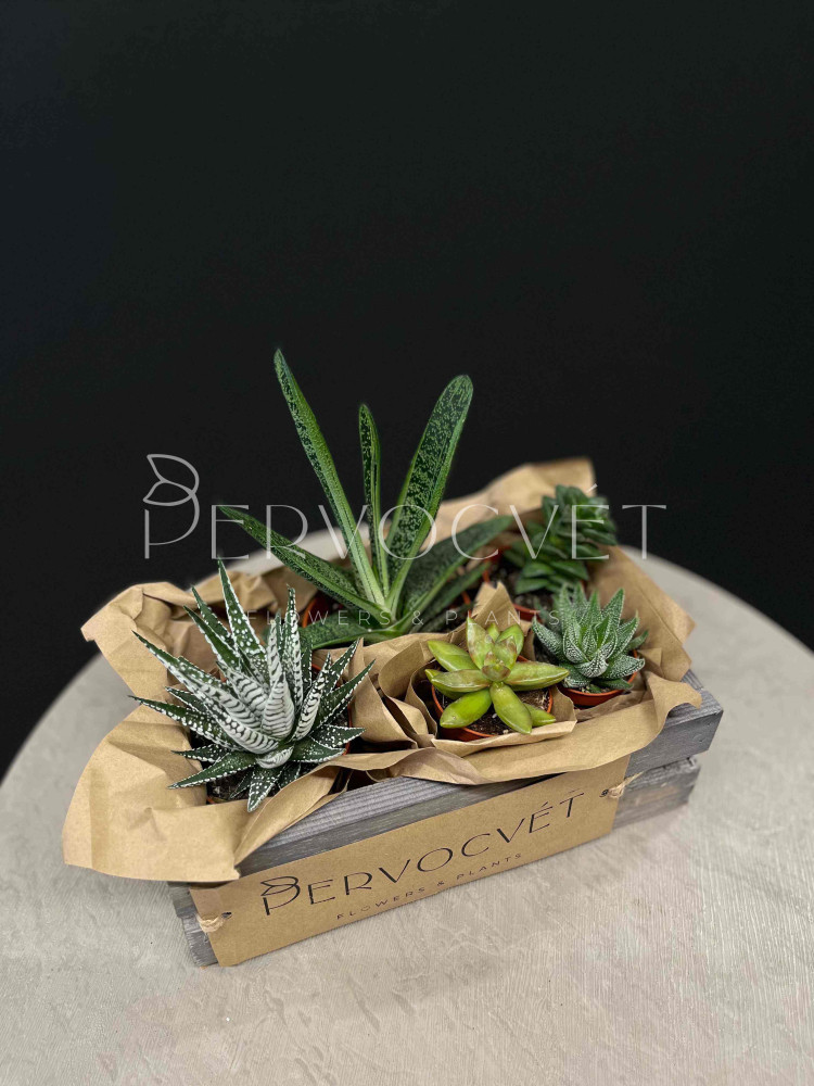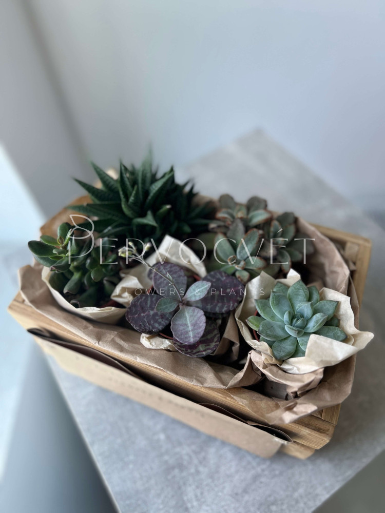 - Растения составлены в деревянный ящик в технических кашпо, дно проложено пленкой (к поливу нужно относиться аккуратно).