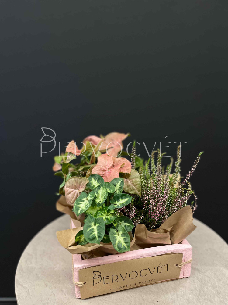 Растения: Сингониум Пикси 20 см, Сингониум Неон Пинк 30 см, Вереск.
