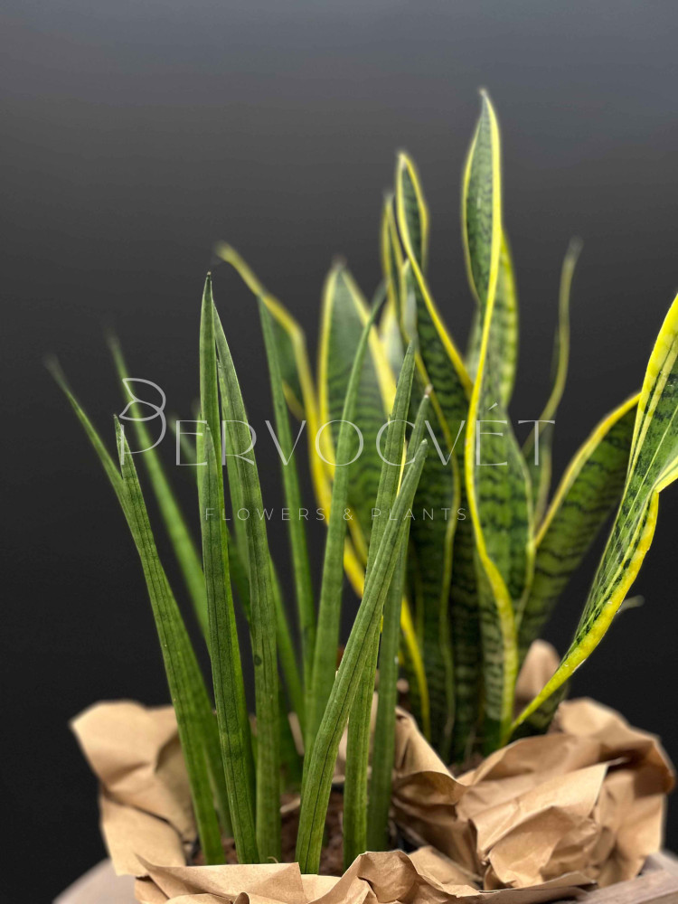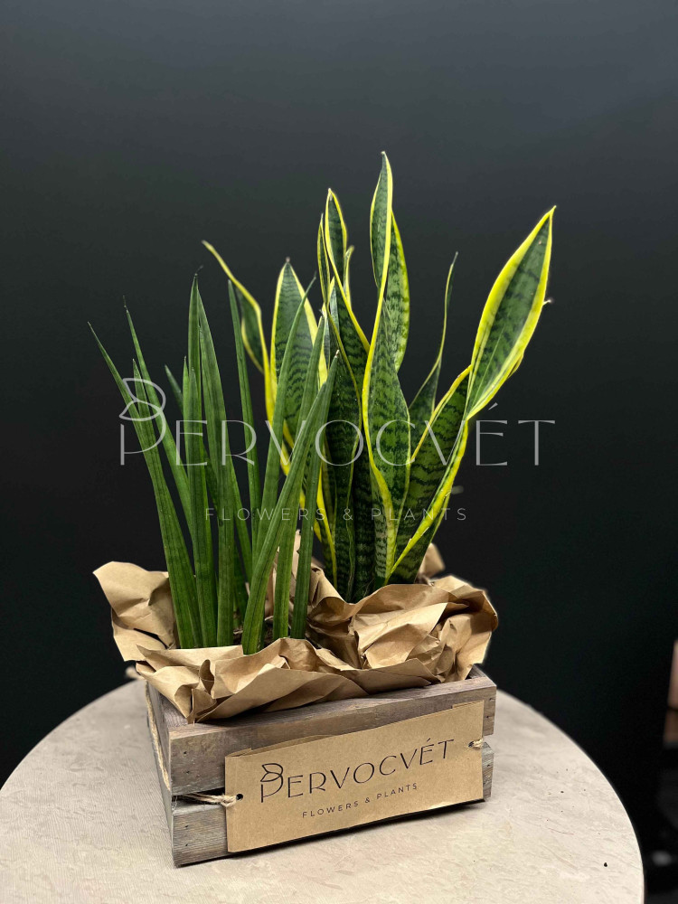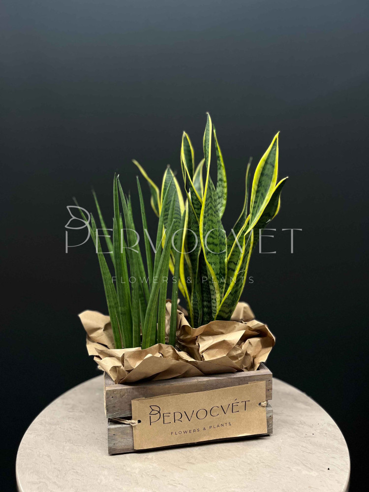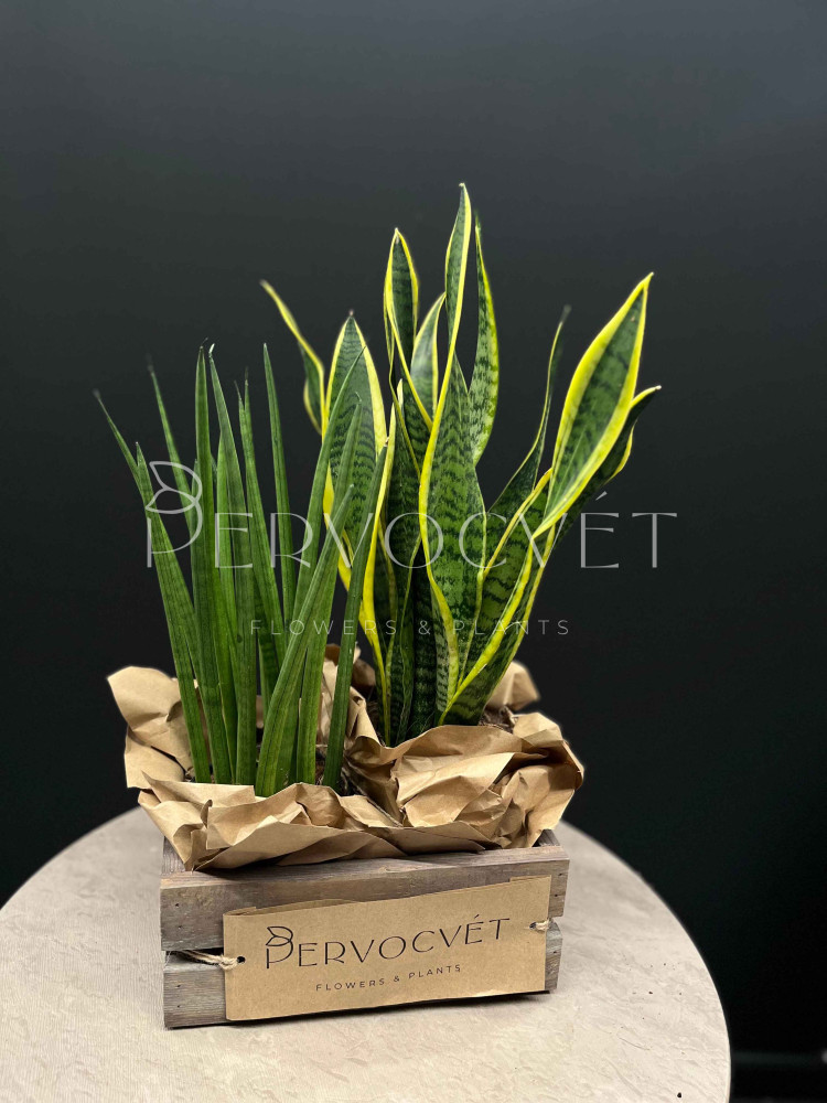 В цветочный набор входят две сансевиерии в подарочном ящичке. Два разных "щучьих хвостика": классический вариант Сансевиерия Суперба, полосатая с желтой каймой, и редкая Сансевиерия Цилиндрика, с вытянутыми трубчатыми побегами. Преимущество набора - два сорта одного вида растения, которое входит в ТОП-3 Самых неприхотливых растений, с одинаковыми требованиями по уходу, но совершенно разным внешним видом, что позволит создать акценты в интерьере и не тратить много времени и сил на уход!