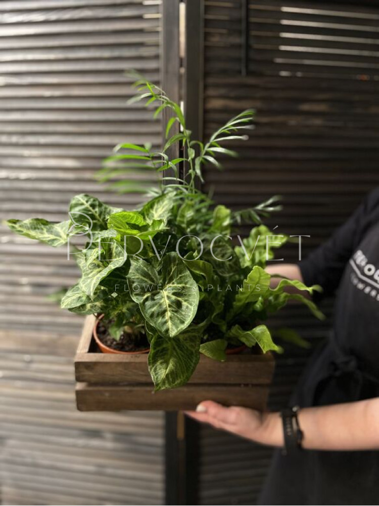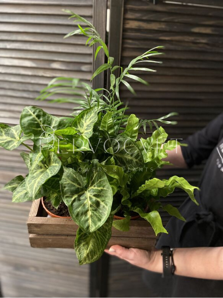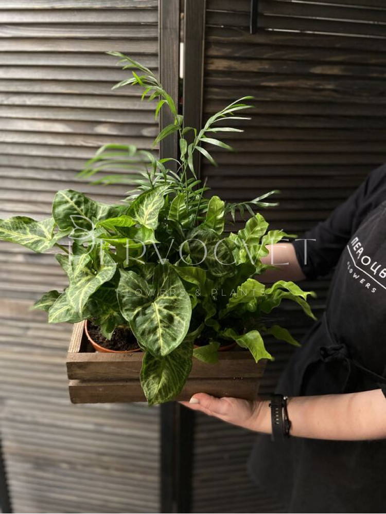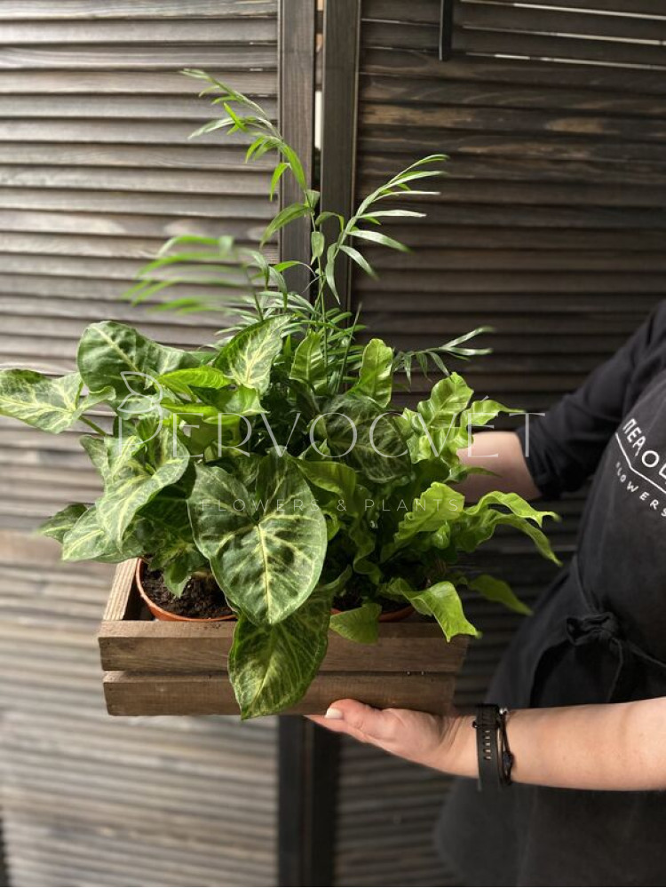 В цветочный набор входят фактурный Асплениум Криспи, Хамедорея и пышный Сингониум. Насыщенно зеленый набор из неприхотливых, но интересных по фактуре и оттенкам растений. Идеально подойдет к любому интерьеру: дом, офис, кофейня, другое.
