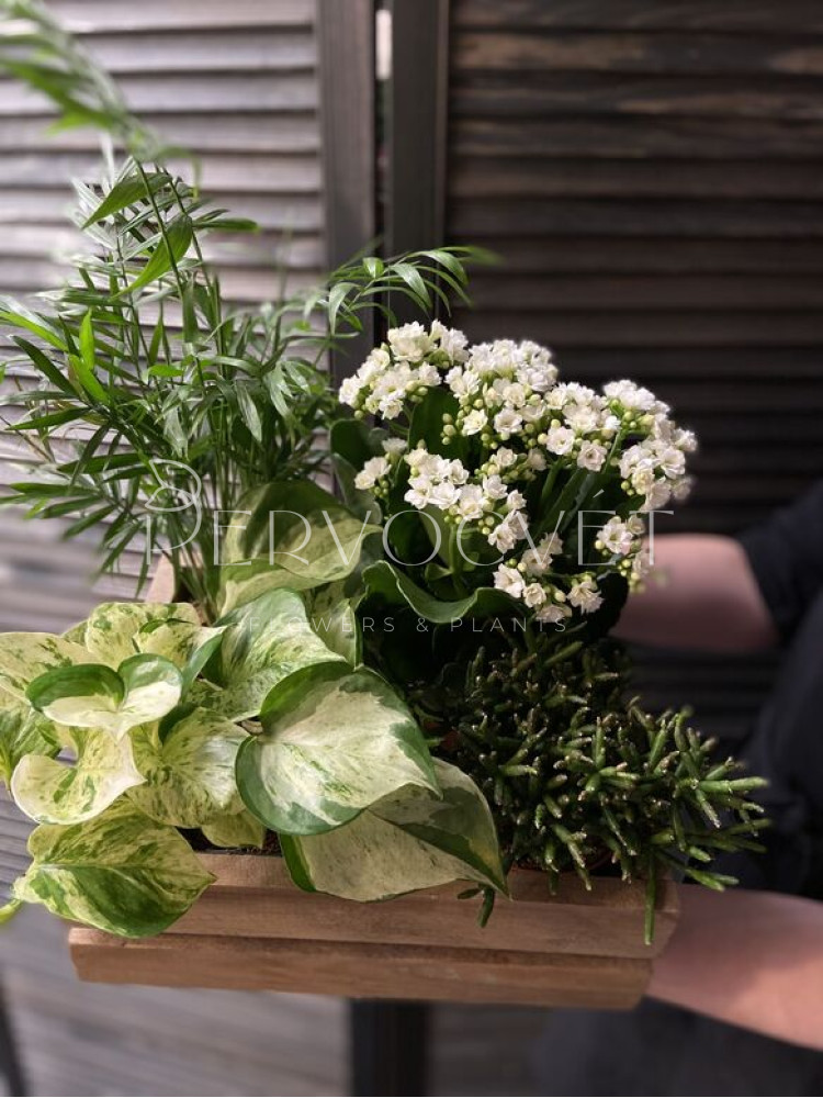 В цветочный набор входят цветущее Каланхоэ, сортовой Эпипремнум (на фото сорт Хэппи Лиф "Happy Leaf"), воздушная Хамедорея и суккулент Рипсалис. Микс цветущего, средне и высоко декоративно-лиственного растения и суккулента. Идеальный подарок для полноценной первой коллекции дома, красивый подарок, неприхотливый в уходе. Отлично смотрится в любом интерьере: дом, кофейня, офис.