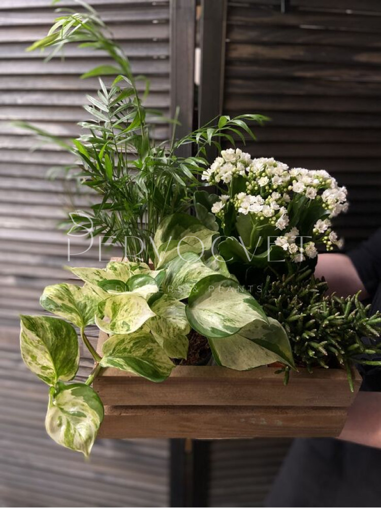 - Растения составлены в деревянный ящик в технических кашпо, дно проложено пленкой (к поливу нужно относиться аккуратно).
