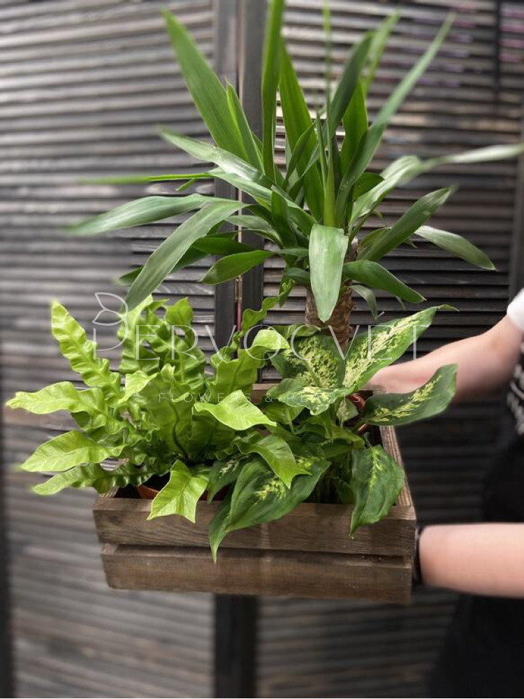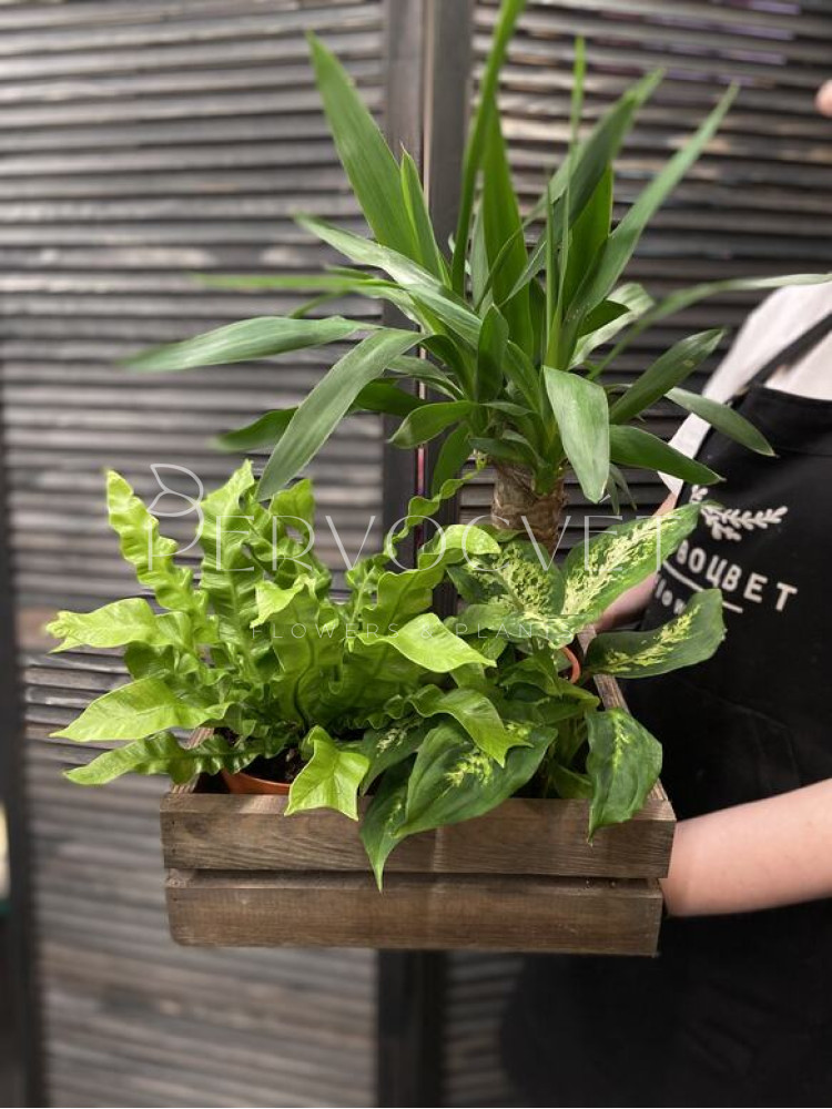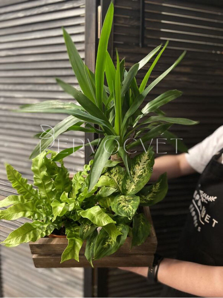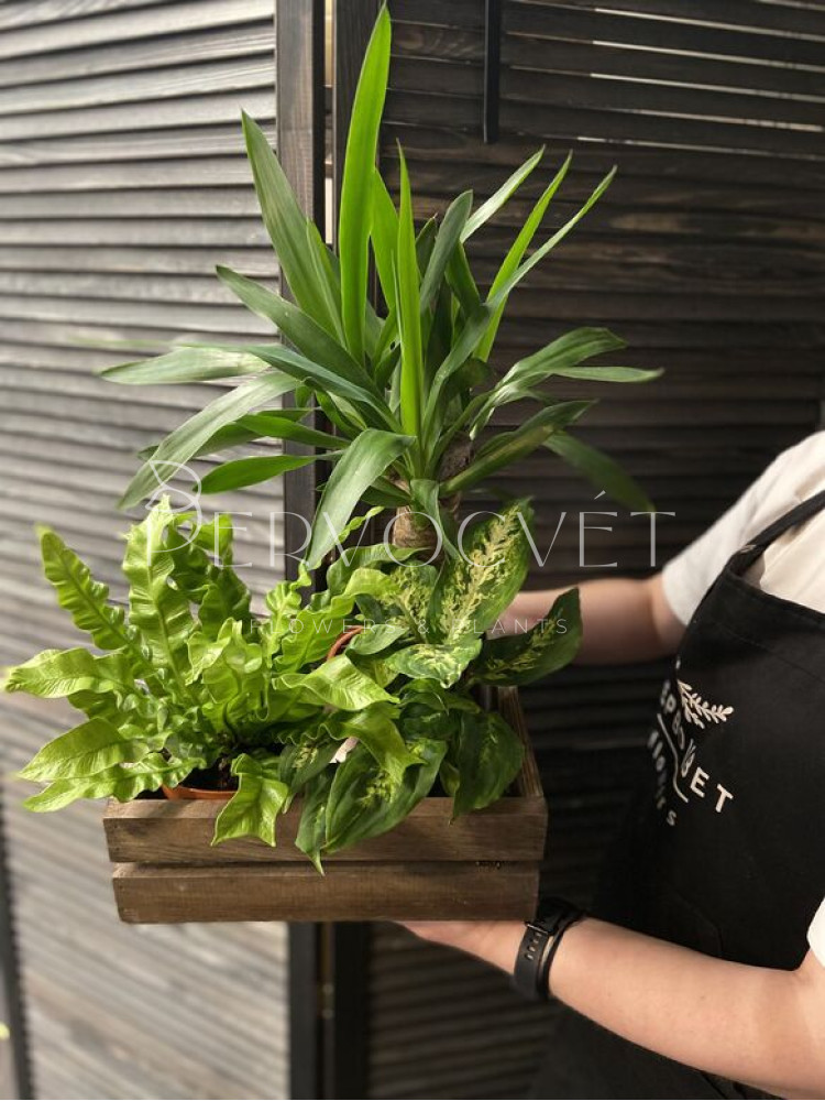 В цветочный набор входят Юкка, фактурный Асплениум Криспи, крупнолистная Диффенбахия. Неприхотливый набор растений разной высотности, для оформления любого интерьера!