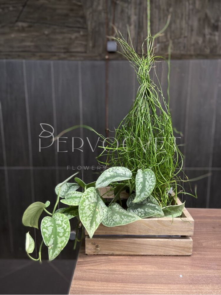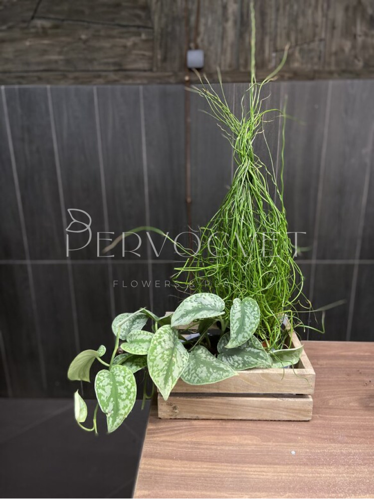 В цветочный набор входят входят ампельный Сциндаптус Треби и пышный Юнкус Спиралис в деревянном ящике. Идеальный подарок для любителей горшечных растений!