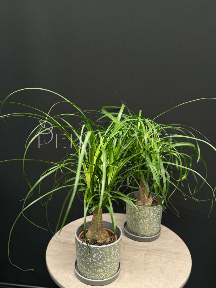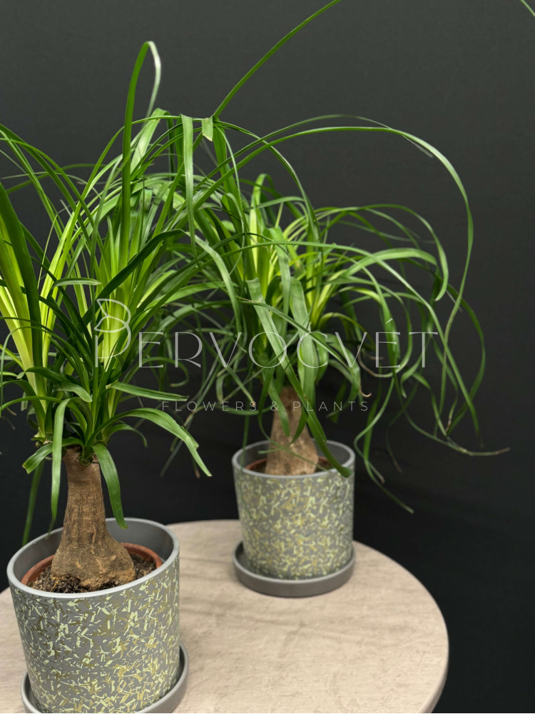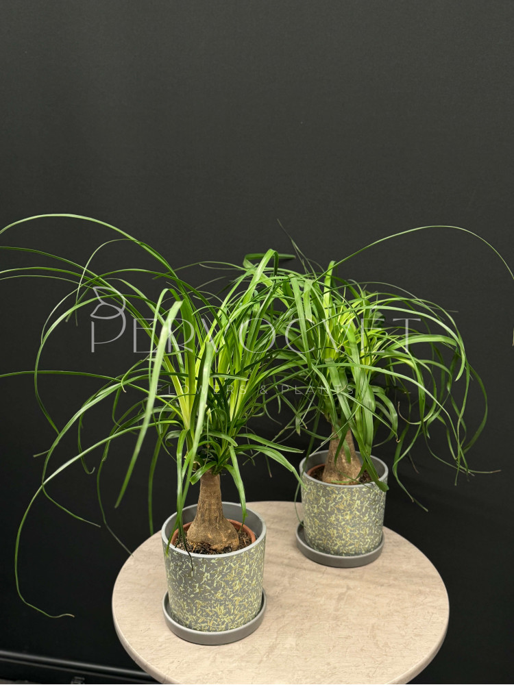 Нолина - представитель семейства Агавовые, ботаническое название которого - Бокарнея, родина - Мексика. Общеизвестное название - лошадиный хвост, из-за формы и размещения листовых пластин. Комнатная нолина - невысокий кустарник с бутылочным стволом, напоминающим Пахиру, в котором накапливается вода (для засушливых периодов). При этом благодаря тонкости листьев влага испаряется медленно. Неприхотливо в уходе, подойдет и украсит любой интерьер.