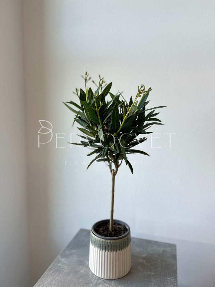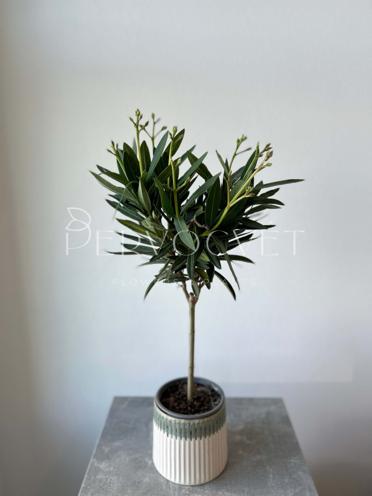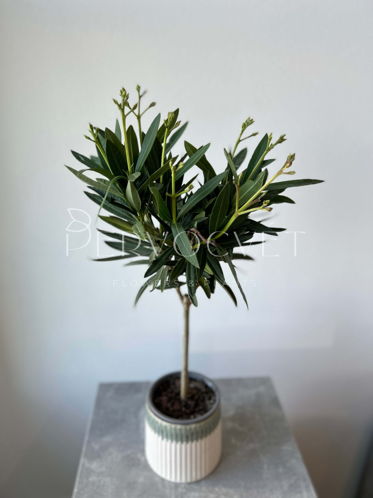 Олеандр, или розовый лавр - растение с заостренными, кожистыми и темно-зелеными листьями. Выращивание Олеандра в домашних условиях требует соблюдения некоторых правил, но растение неприхотливо и цветущий представитель растет у многих цветоводов по всему миру! Красивоцветущий экземпляр уже выращен на штамбе, благодаря чему мы получаем красивое и цветущее деревце. Подробнее про уход читайте ниже.