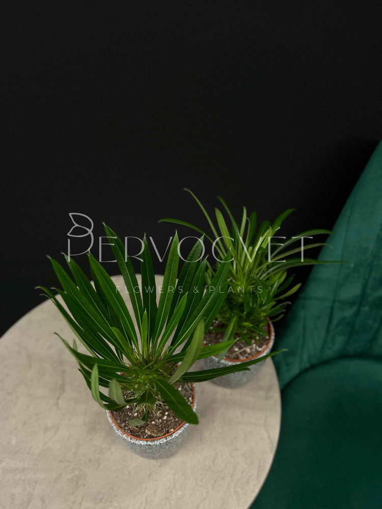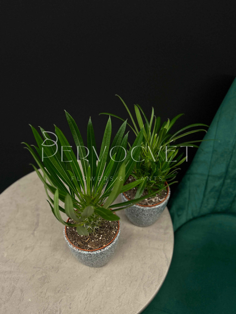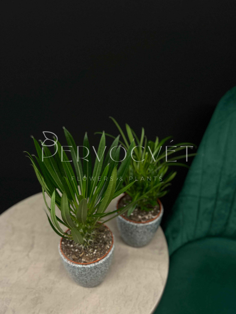 Пахиподиум - яркий индивидуальный суккулент семейства Кутровых. С греческого языка название переводится как "толстая ножка". Родиной пахиподиумов являются засушливые территории Африки, Намибии и Мадагаскара. В домашних условиях цветет редко (но цветение наступает на 4-6 год) и ценится за необычную форму.