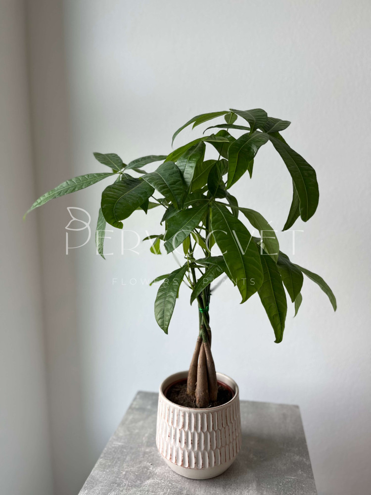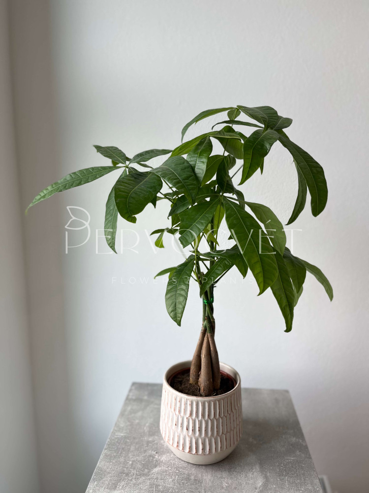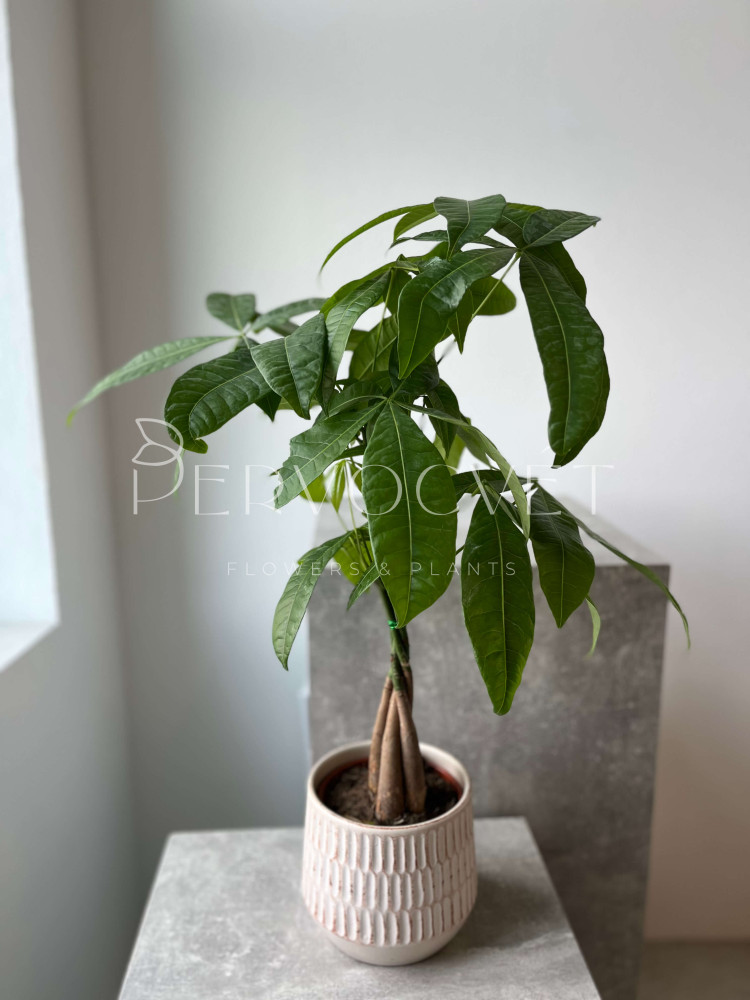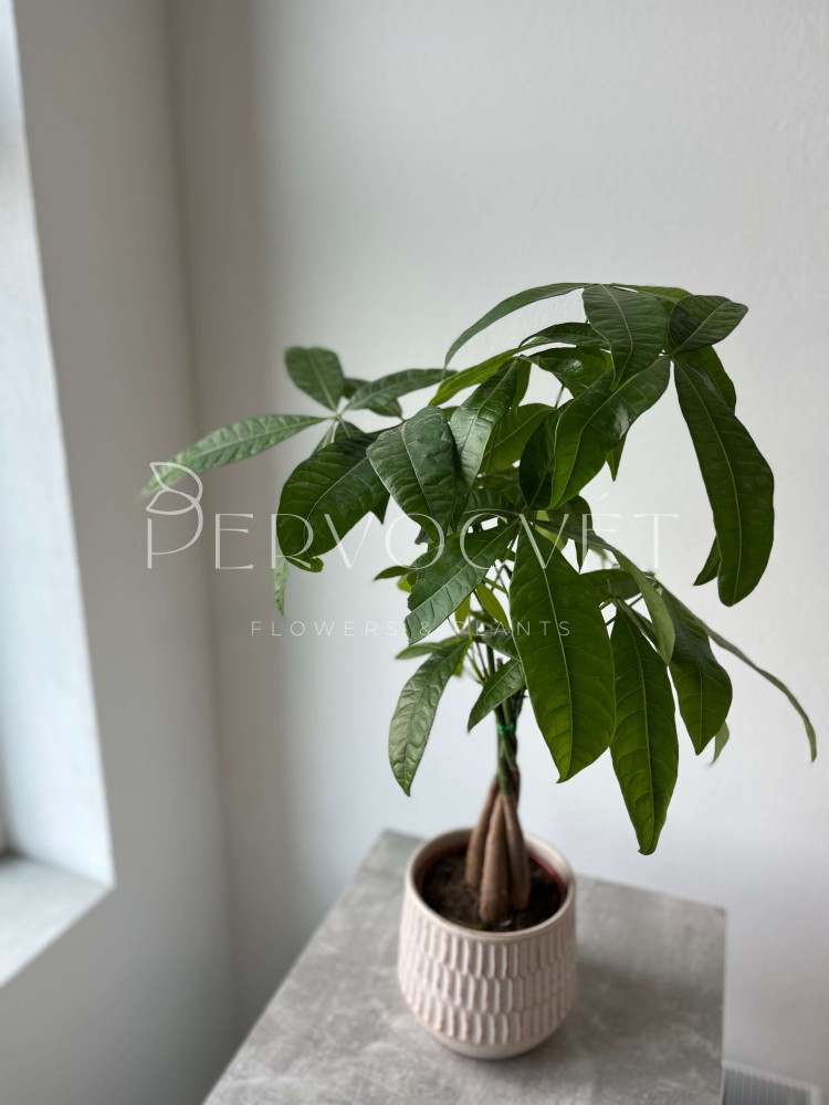 Пахира Водная - в переводе с латыни "Толстушка", представитель тропических лесов Южной Америки, отличается диковинным и оригинальным внешним видом как стволов, так и листьев. Стволы способны накапливать воду в нижней части, расширяясь и приобретая форму бутылки, поэтому растение также известно как "бутылочное дерево".