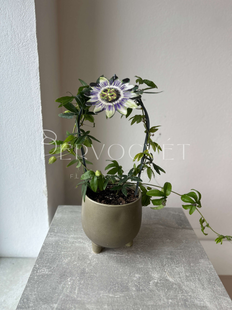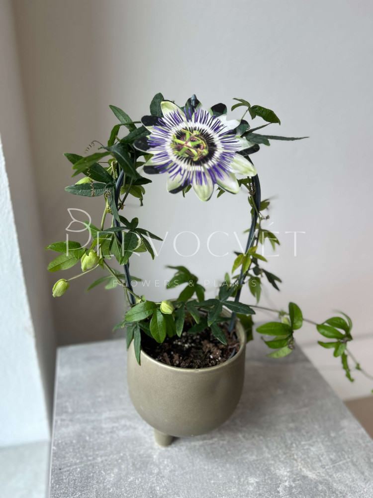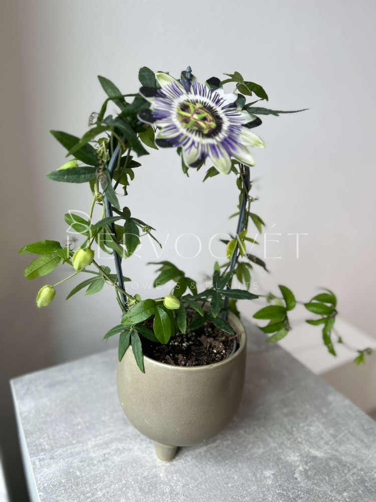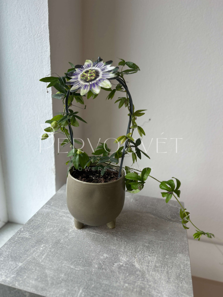 Пассифлора, или Страстоцвет - светолюбивая тропическая лиана, нуждается в опоре и питательном грунте. Не любит смены мест, и особенно ценится за уникальное красивое цветение. Цветы сиреневого или красного цвета, в зависимости от сорта, звездообразной экзотической формы (точно как на картинке). Подробнее про уход читайте ниже, растение требовательное, но очень красивое!