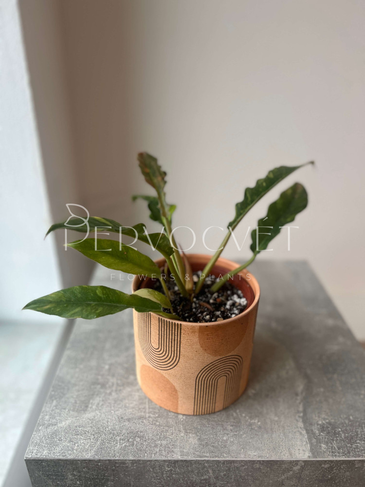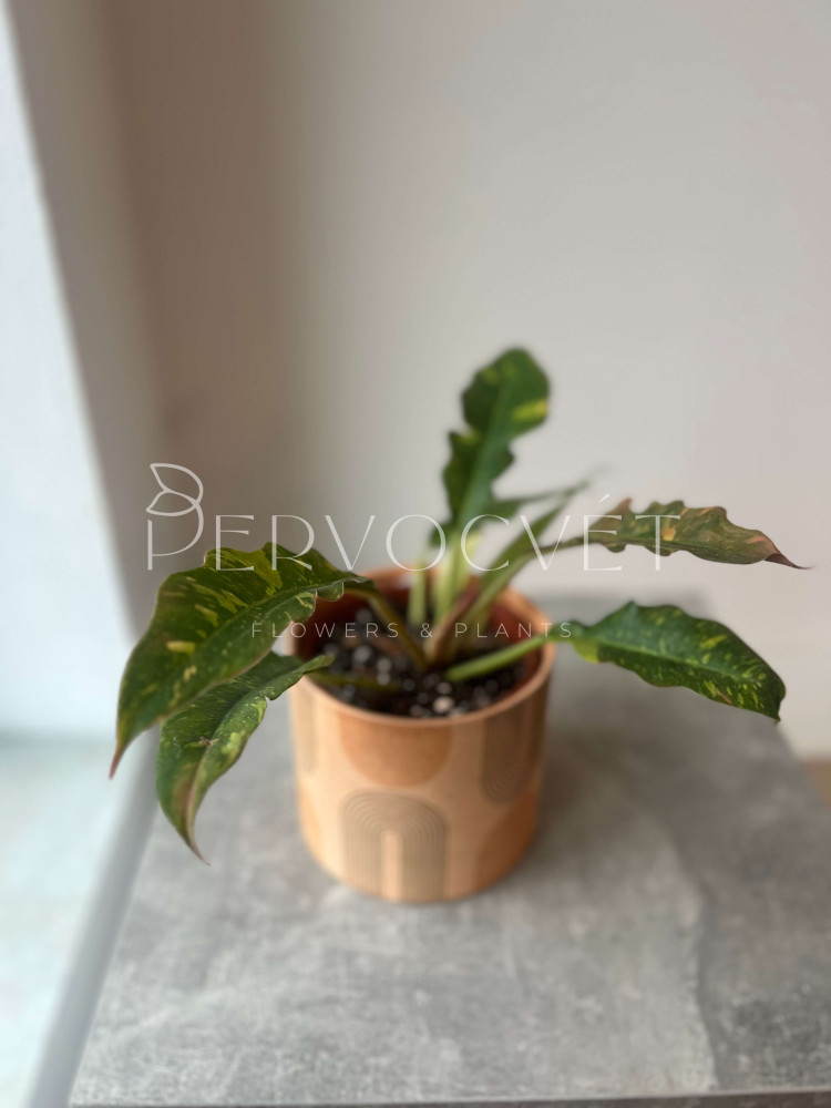 Филодендрон - перспективная сортовая группа, которая развивается активно последние несколько лет. Все больше видов и сортов, за которыми охотятся все. Ринг Оф Фаер (Ring of Fire) - особенный сорт, Огненное кольцо в переводе. Этот филодендрон аналог самого желанного Карамель Марбл, но также имеет свою уникальную вариегатность: хаотичные пятна светло-зеленого цвета с более мелкими оранжевыми. Образует красивую розетку, раскидистую, с крупными продолговатыми зазубренными листьями.
