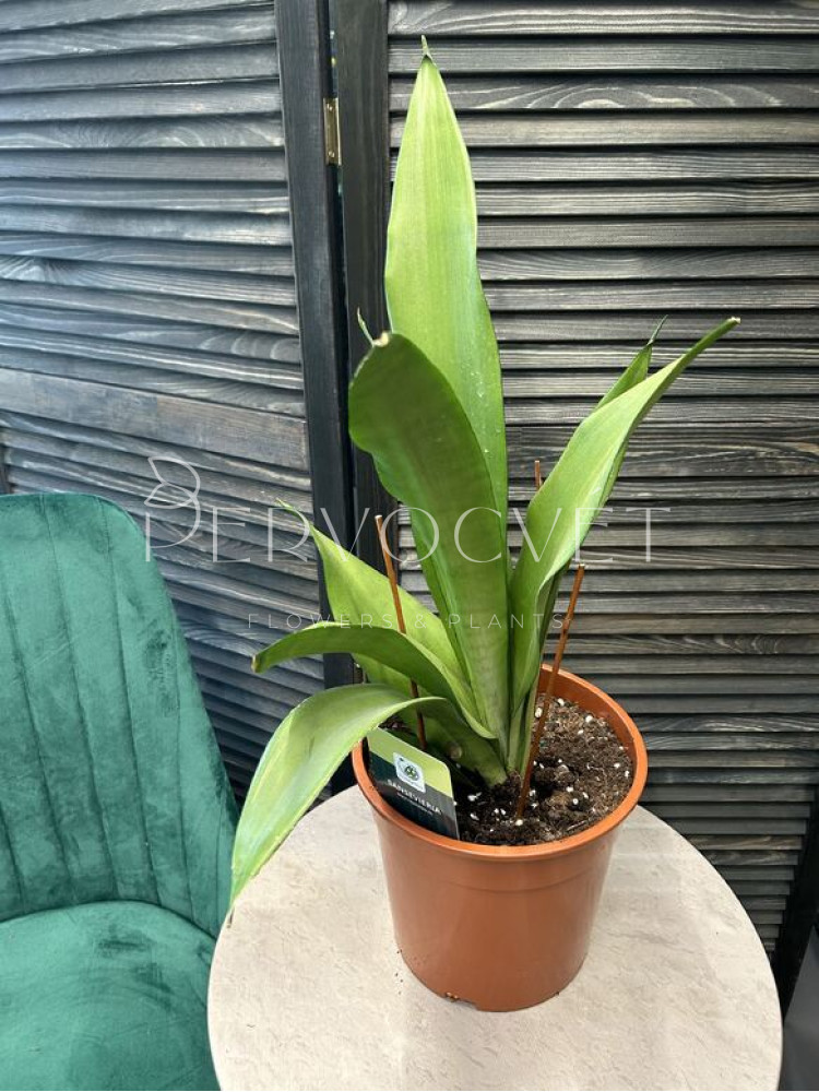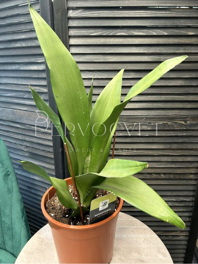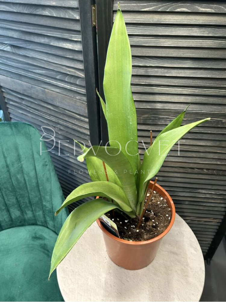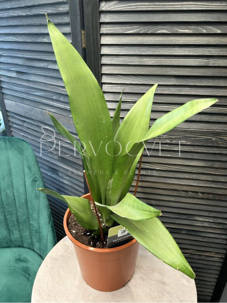 Сансевиерия - неприхотливое растение, известное всем под названиями "щучий хвост" и "тещин язык". Существует несколько типов, видов и сортов сансевиерий. Светло-зеленая с белым оттенков Санса Муншайн отличается широкими и вытянутыми листьями, однотонными с голубовато-белым оттенком.