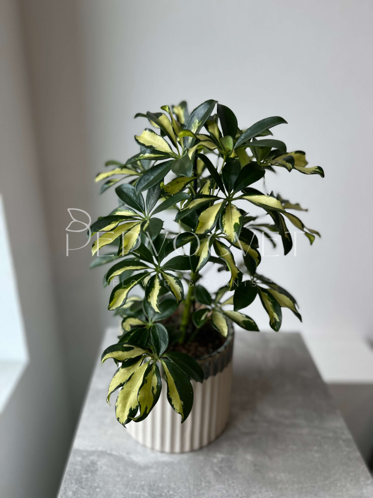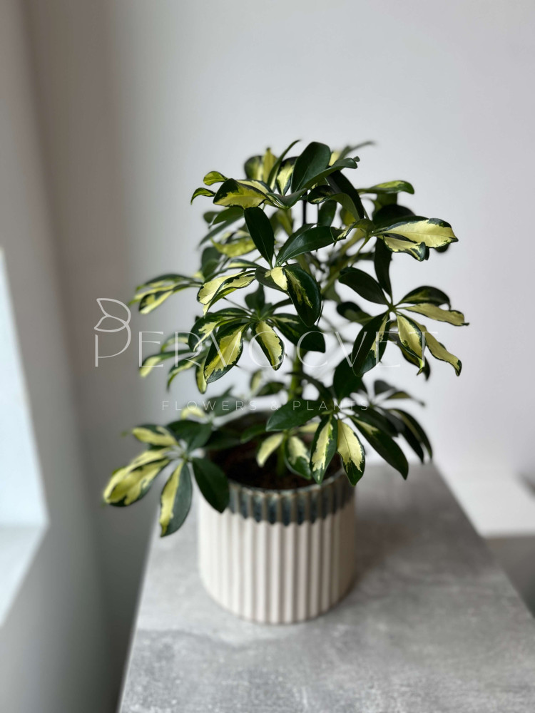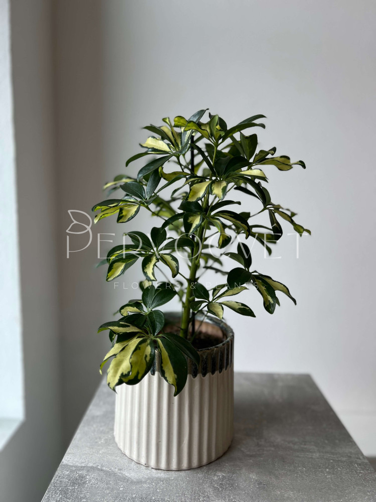 Шеффлера - культурная форма древовидных Шеффлер, которые произрастают в тропическом поясе. Максимальная высота домашнего растения 120 см. Цветения в домашних условиях не происходит, ценность представляет "зонтичная", сочная, двухцветная листва. При этом растение неприхотливо и легко в выращивании. Подробнее про уход читайте ниже.